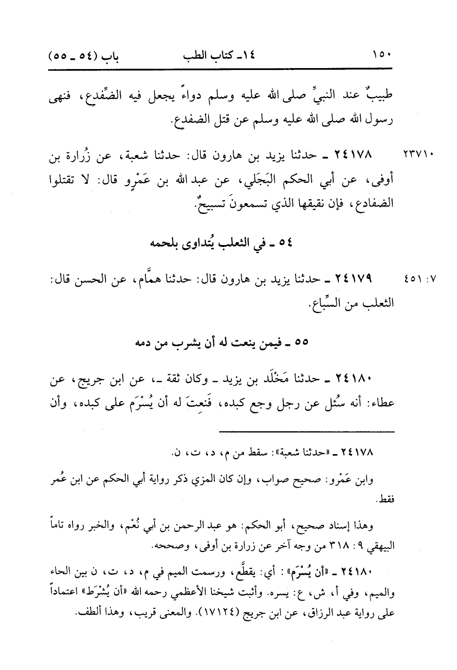 24178- حَدَّثَنَا يَزِيدُ بْنُ هَارُونَ , قَالَ : حدَّثَنَا شُعْبَةُ ، عَنْ زُرَارَةَ بْنِ أَوْفَى ، عَنْ أَبِي الْحَكَمِ الْبَجَلِيِّ ، عَنْ عَبْدِ اللهِ بْنِ عَمْرٍو ، قَالَ : لاَ تَقْتُلُوا الضَّفَادِعَ ، فَإِنَّ نَقِيقَهَا الَّذِي تَسْمَعُونَ ، تَسْبِيحٌ.