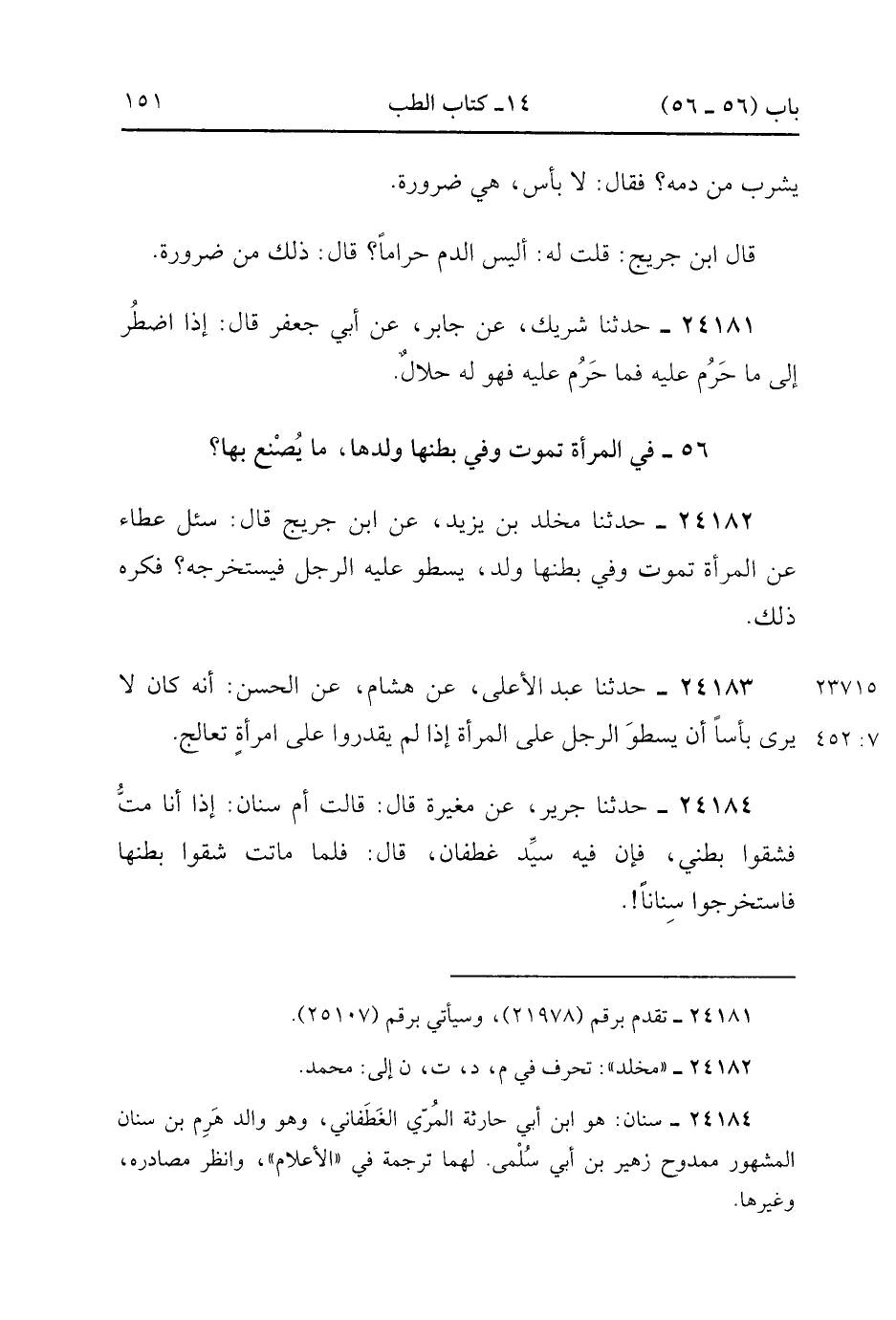 24184- حَدَّثَنَا جَرِيرٌ ، عَنْ مُغِيرَةَ ، قَالَ : قَالَتْ أُمُّ سِنَانٍ : إِذَا أَنَا مِتَّ فَشُقُّوا بَطْنِي ، فَإِنَّ فِيهِ سَيِّدَ غَطَفَانَ ، قَالَ : فَلَمَّا مَاتَتْ شَقُّوا بَطْنَهَا فَاسْتَخْرَجُوا سِنَانًا. (7/452).