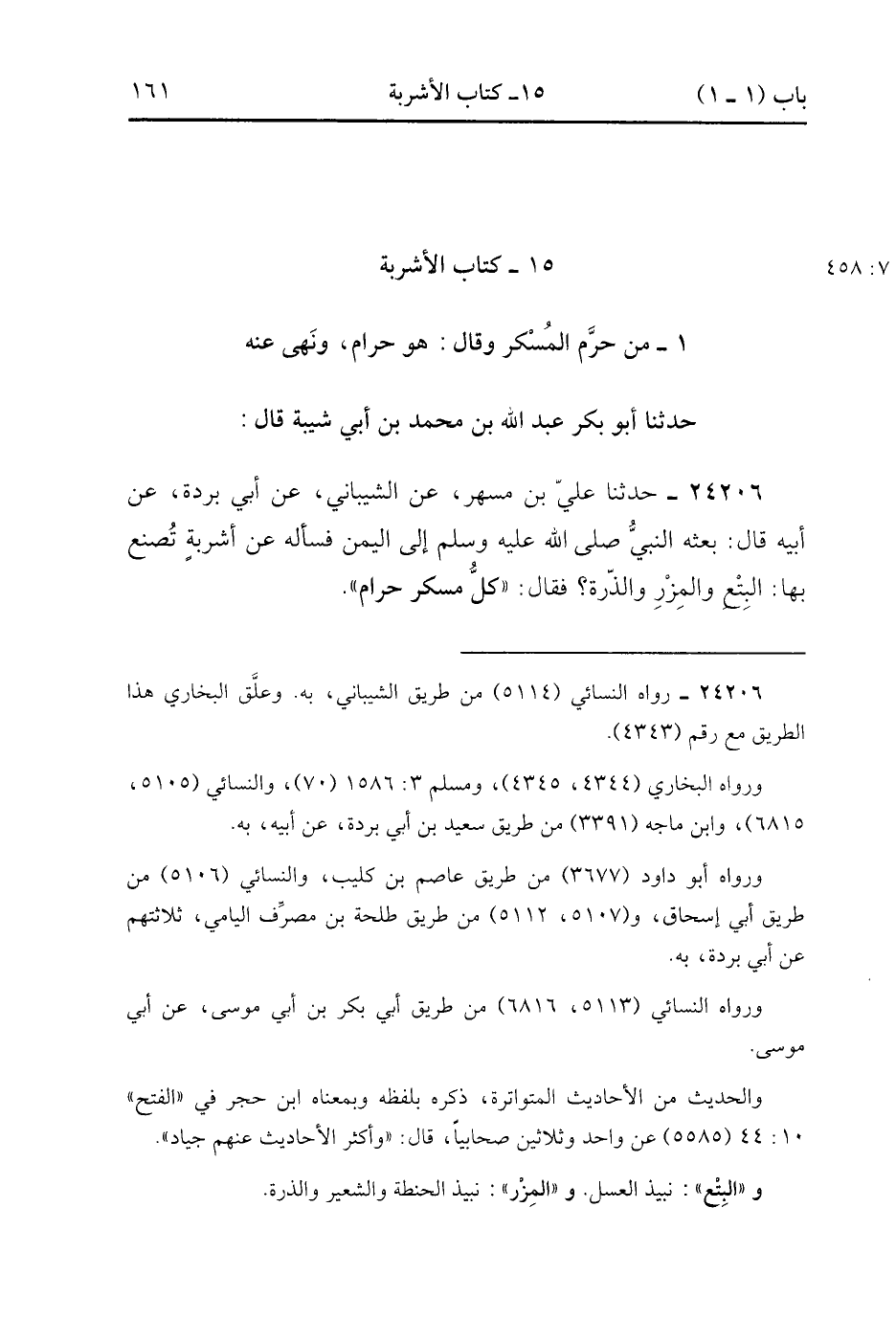 24206- حدَّثَنَا عَلِيُّ بْنُ مُسْهِرٍ ، عَنِ الشَّيْبَانِيِّ ، عَنْ أَبِي بُرْدَةَ ، عَنْ أَبِيهِ ، قَالَ : بَعَثَهُ النَّبِيُّ صَلَّى الله عَلَيْهِ وَسَلَّمَ إِلَى الْيَمَنِ ، فَسَأَلَهُ عَنْ أَشْرِبَةٍ تُصْنَعُ بِهَا : الْبِتْعُ ، وَالْمِزْرُ ، وَالذُّرَةِ ، فَقَالَ : كُلَّ مُسْكِرٍ حَرَامٌ. (7/458).