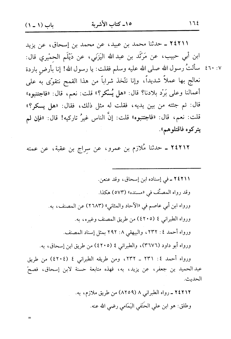 24211- حَدَّثَنَا مُحَمَّدُ بْنُ عُبَيْدٍ ، عَنْ مُحَمَّدِ بْنِ إِسْحَاقَ ، عَنْ يَزِيدَ بْنِ أَبِي حَبِيبٍ ، عَنْ مَرْثَدِ بْنِ عَبْدِ اللهِ الْيَزَنِيِّ ، عَنْ دَيْلَمٍ الْحِمْيَرِيِّ قَالَ : سَأَلْتُ رَسُولَ اللهِ صَلَّى الله عَلَيْهِ وَسَلَّمَ ، فَقُلْتُ : يَا رَسُولَ اللهِ ، إِنَّا بِأَرْضٍ بَارِدَةٍ نُعَالِجُ بِهَا عَمَلاً شَدِيدًا ، وَإِنَّا نَتَّخِذُ شَرَابًا مِنْ هَذَا الْقَمْحِ نَتَقَوَّى بِهِ عَلَى أَعْمَالِنَا ، وَعَلَى بَرْدِ بِلاَدِنَا ؟ قَالَ : هَلْ يُسْكِرُ ؟ قُلْتُ : نَعَمْ ، قَالَ : فَاجْتَنِبُوهُ ، قَالَ : ثُمَّ جِئْتُهُ مِنْ بَيْنِ يَدَيْهِ ، فَقُلْتُ لَهُ مِثْلَ ذَلِكَ ، فَقَالَ : هَلْ يُسْكِرُ ؟ قُلْتُ : نَعَمْ ، قَالَ : فَاجْتَنِبُوهُ ، قُلْتُ : إِنَّ النَّاسَ غَيْرُ تَارِكِيهِ ، قَالَ : فَإِنْ لَمْ يَتْرُكُوهُ فَاقْتُلُوهُمْ. (7/459).