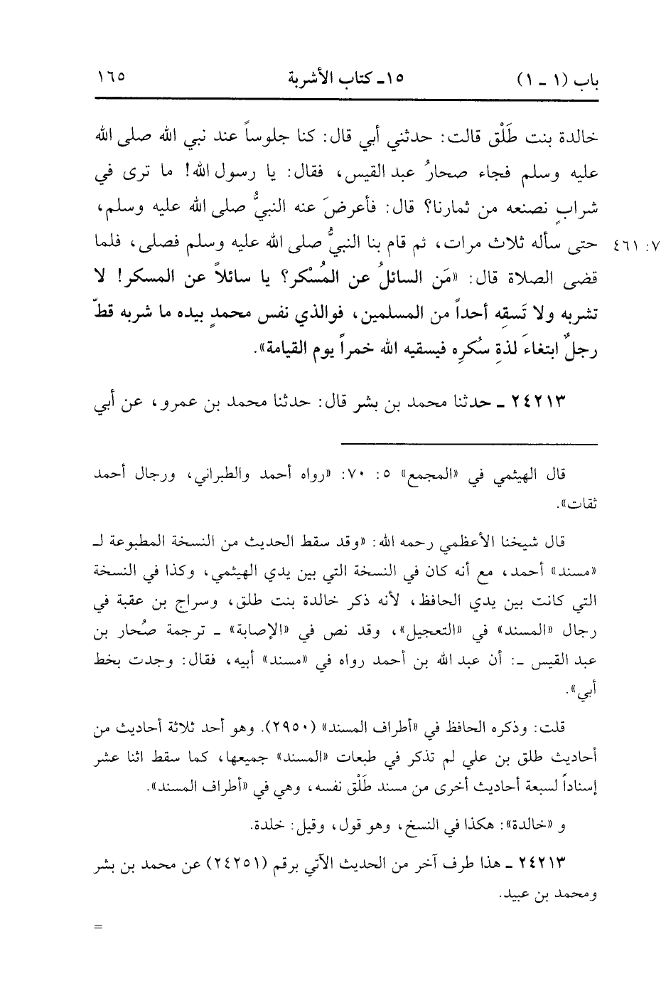24212- حَدَّثَنَا مُلاَزِمُ بْنُ عَمْرٍو ، عَنْ سِرَاجِ بْنِ عُقْبَةَ ، عَنْ عَمَّتِهِ خَالِدَةَ (1) بِنْتِ طَلْقٍ ، قَالَتْ : حدَّثَنِي أَبِي ، قَالَ : كُنَّا جُلُوسًا عِنْدَ نَبِيِّ اللهِ صَلَّى الله عَلَيْهِ وَسَلَّمَ ، فَجَاءَ صُحَارُ عَبْدِ الْقَيْسِ ، فَقَالَ : يَا رَسُولَ اللهِ ، مَا تَرَى فِي شَرَابٍ نَصْنَعُهُ مِنْ ثِمَارِنَا ؟ قَالَ : فَأَعْرَضَ عَنْهُ النَّبِيُّ صَلَّى الله عَلَيْهِ وَسَلَّمَ حَتَّى سَأَلَهُ ثَلاَثَ مَرَّاتٍ ، ثُمَّ قَامَ بِنَا النَّبِيُّ صَلَّى الله عَلَيْهِ وَسَلَّمَ فَصَلَّى ، فَلَمَّا قَضَى الصَّلاَةَ ، قَالَ : مَنِ السَّائِلُ عَنِ الْمُسْكِرِ ؟ يَا سَائِلاً عَنِ الْمُسْكِرِ ، لاَ تَشْرَبْهُ ، وَلاَ تَسْقِهِ أَحَدًا مِنَ الْمُسْلِمِينَ ، فَوَالَّذِي نَفْسُ مُحَمَّدٍ بِيَدِهِ ، مَا شَرِبَهُ قَطُّ رَجُلٌ ابْتِغَاءَ لَذَّةِ سُكْرِهِ ، فَيَسْقِيَهُ اللَّهُ خَمْرًا يَوْمَ الْقِيَامَةِ. (7/460).