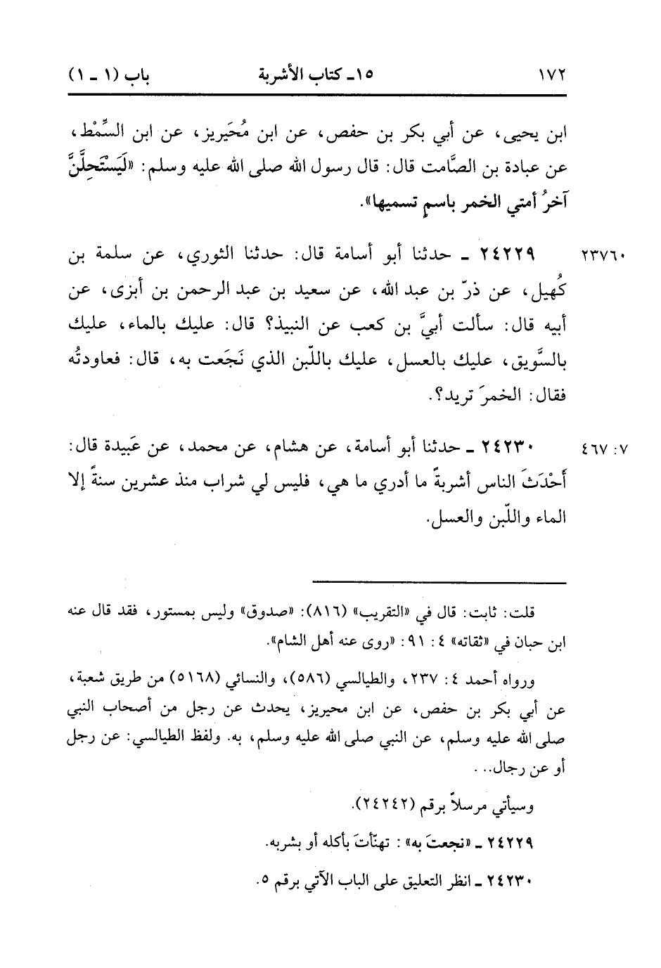 24229- حَدَّثَنَا أَبُو أُسَامَةَ , قَالَ : حدَّثَنَا الثَّوْرِيُّ ، عَنْ سَلَمَةَ بْنِ كُهَيْلٍ ، عَنْ ذَرِّ بْنِ عَبْدِ اللهِ ، عَنْ سَعِيدِ بْنِ عَبْدِ الرَّحْمَنِ بْنِ أَبْزَى ، عَنْ أَبِيهِ ، قَالَ : سَأَلْتُ أُبَيَّ بْنَ كَعْبٍ عَنِ النَّبِيذِ ؟ قَالَ : عَلَيْكَ بِالْمَاءِ ، عَلَيْكَ بِالسَّوِيقِ ، عَلَيْكَ بِالْعَسَلِ ، عَلَيْكَ بِاللَّبَنِ الَّذِي نَجَعَتْ بِهِ ، قَالَ : فَعَاوَدْتُهُ فَقَالَ : الْخَمْرَ تُرِيدُ ؟. (7/466).