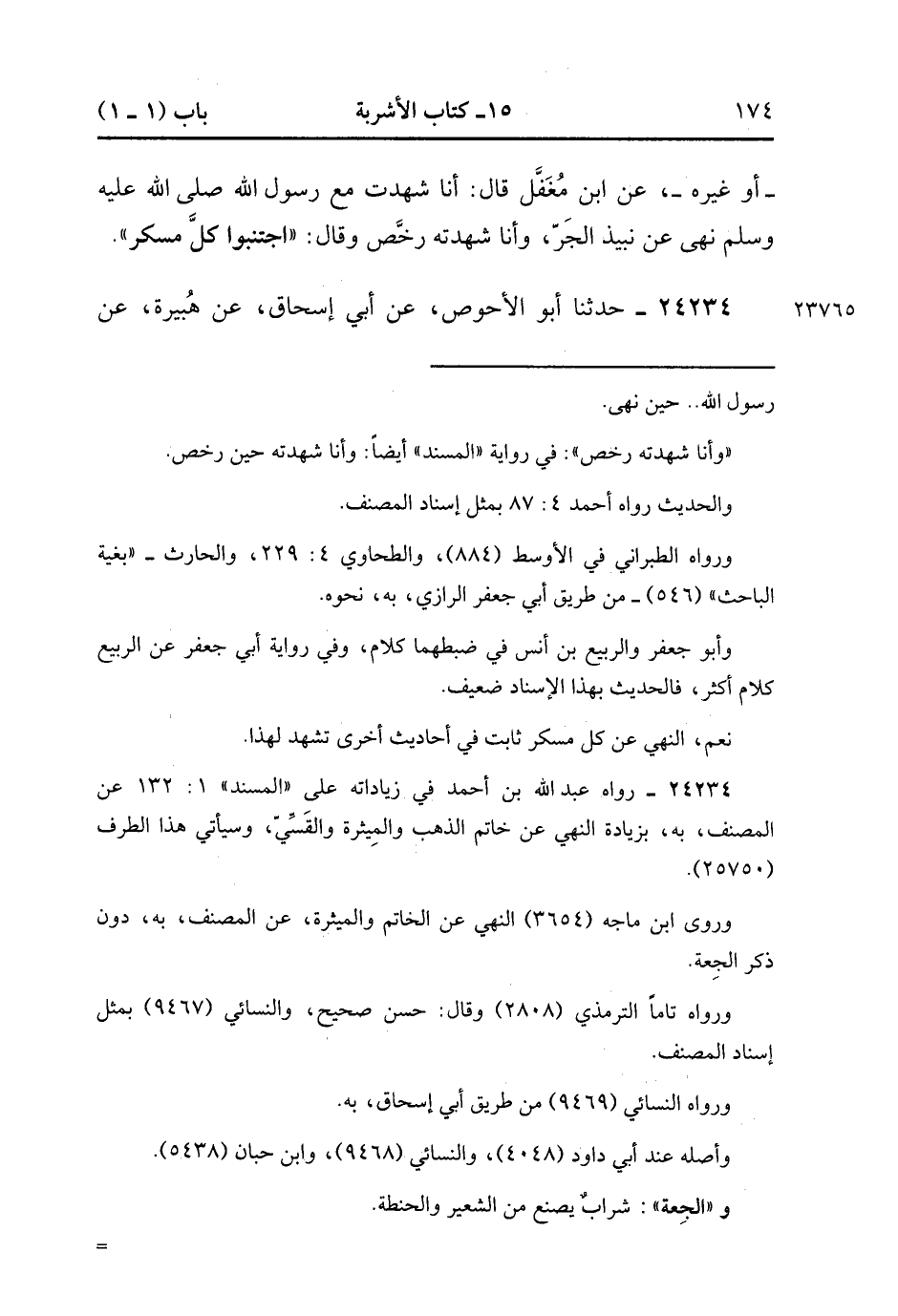 24233- حَدَّثَنَا وَكِيعٌ ، عَنْ أَبِي جَعْفَرٍ ، عَنِ الرَّبِيعِ ، عَنْ أَبِي الْعَالِيَةِ ، أَوْ غَيْرِهِ ، عَنِ ابْنِ مُغَفَّلٍ ، قَالَ : أَنَا شَهِدْتُ مَعَ رَسُولَ اللهِ صَلَّى الله عَلَيْهِ وَسَلَّمَ نَهَى عَنْ نَبِيذِ الْجَرِّ ، وَأَنَا شَهِدْتُهُ رَخَّصَ وَقَالَ : اجْتَنِبُوا كُلَّ مُسْكِرٍ.