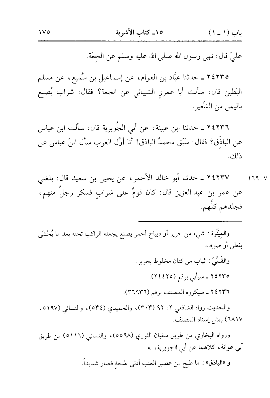 24235- حَدَّثَنَا عَبَّادُ بْنُ الْعَوَّامِ ، عَنْ إِسْمَاعِيلَ بْنِ سُمَيْعٍ ، عَنْ مُسْلِمٍ الْبَطِينِ ، قَالَ : سَأَلْتُ أَبَا عَمْرٍو الشَّيْبَانِيَّ عَنِ الْجِعَةِ ؟فَقَالَ : شَرَابٌ يُصْنَعُ بِالْيَمَنِ مِنَ الشَّعِيرِ.