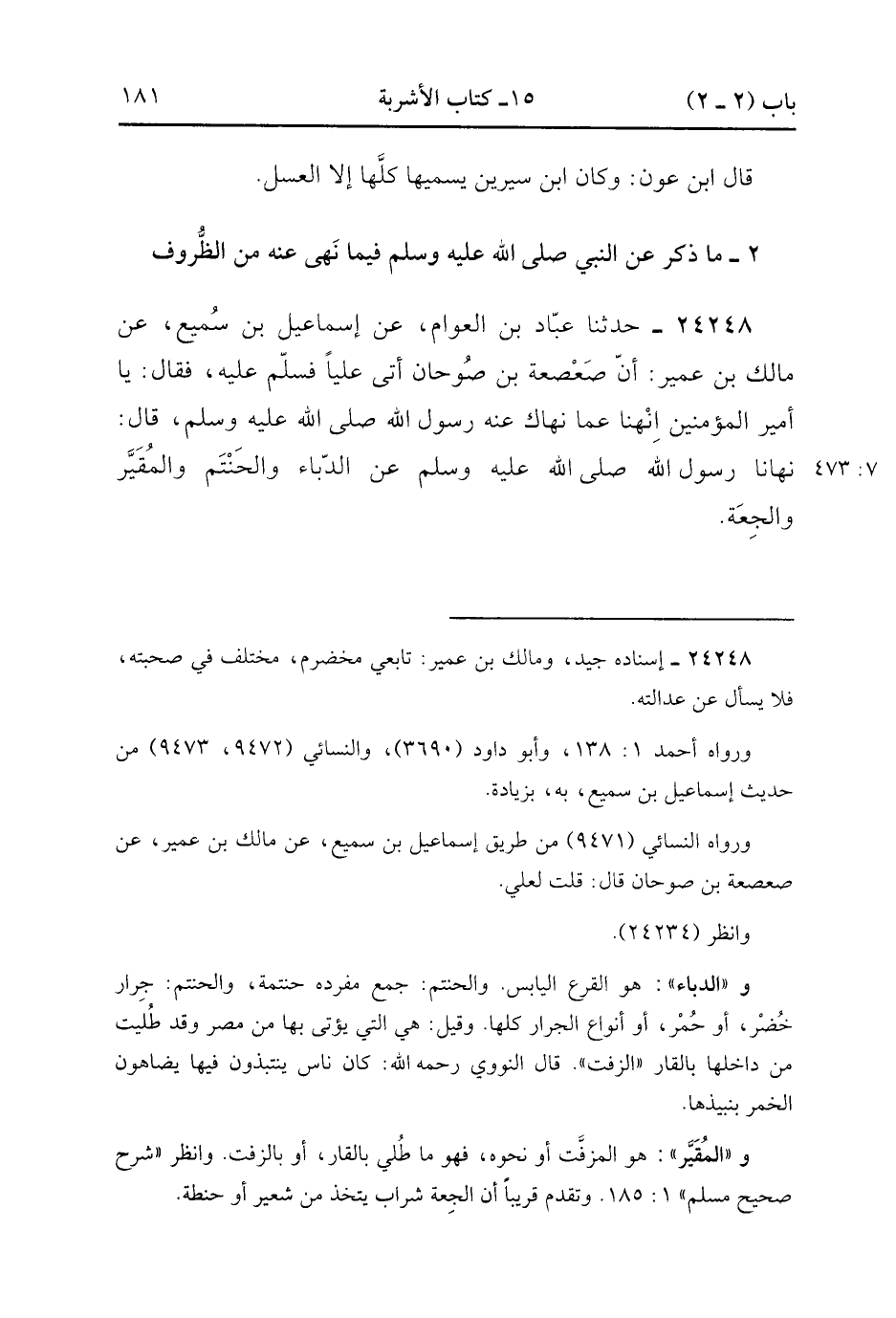 24248- حَدَّثَنَا عَبَّادُ بْنُ الْعَوَّامِ ، عَنْ إِسْمَاعِيلَ بْنِ سُمَيْعٍ ، عَنْ مَالِكِ بْنِ عُمَيْرٍ ؛ أَنَّ صَعْصَعَةَ بْنَ صُوحَانَ أَتَى عَلِيًّا فَسَلَّمَ عَلَيْهِ ، فَقَالَ : يَا أَمِيرَ الْمُؤْمِنِينَ ، اِنْهِنَا عَمَّا نَهَاكَ عَنْهُ رَسُولُ اللهِ صَلَّى الله عَلَيْهِ وَسَلَّمَ : قَالَ : نَهَانَا رَسُولُ اللهِ صَلَّى الله عَلَيْهِ وَسَلَّمَ عَنِ الدُّبَّاءِ ، وَالْحَنْتَمِ ، وَالْمُقَيَّرِ ، وَالْجِعَةِ. (7/472).