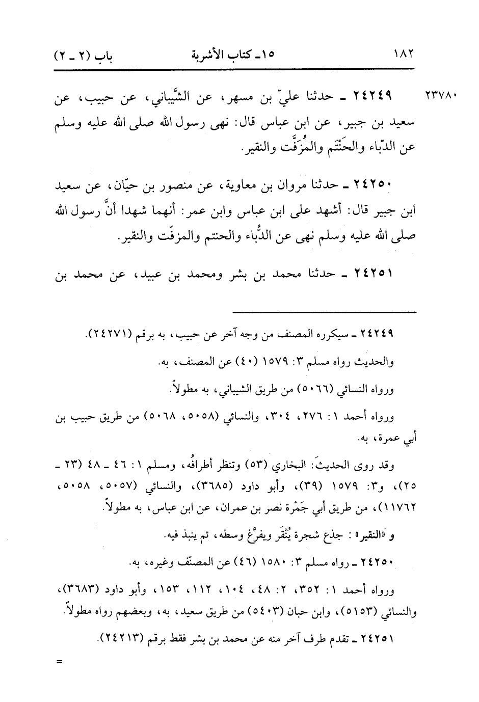 24250- حَدَّثَنَا مَرْوَانُ بْنُ مُعَاوِيَةَ ، عَنْ مَنْصُورِ بْنِ حَيَّانَ ، عَنْ سَعِيدِ بْنِ جُبَيْرٍ ، قَالَ : أَشْهَدُ عَلَى ابْنِ عَبَّاسٍ ، وَابْنِ عُمَرَ ، أَنَّهُمَا شَهِدَا أَنَّ رَسُولَ اللهِ صَلَّى الله عَلَيْهِ وَسَلَّمَ نَهَى عَنِ الدُّبَّاءِ ،وَالْحَنْتَمِ ، وَالْمُزَفَّتِ ، وَالنَّقِيرِ.