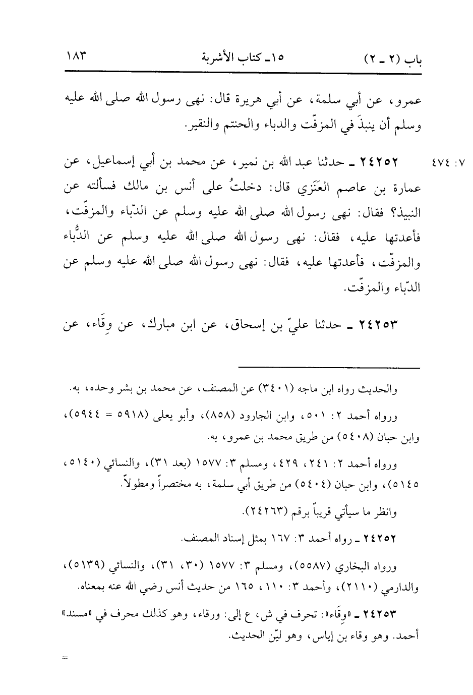 24252- حَدَّثَنَا عَبْدُ اللهِ بْنُ نُمَيْرٍ ، عَنْ مُحَمَّدِ بْنِ أَبِي إسْمَاعِيلَ ، عَنْ عُمَارَةَ بْنِ عَاصِمٍ الْعَنَزِيِّ ، قَالَ : دَخَلْتُ عَلَى أَنَسِ بْنِ مَالِكٍ فَسَأَلْتُهُ عَنِ النَّبِيذِ ، فَقَالَ : نَهَى رَسُولُ اللهِ صَلَّى الله عَلَيْهِ وَسَلَّمَ عَنِ الدُّبَّاءِ وَالْمُزَفَّتِ ؟ فَأَعَدْتُهَا عَلَيْهِ فَقَالَ : نَهَى رَسُولُ اللهِ صَلَّى الله عَلَيْهِ وَسَلَّمَ عَنِ الدُّبَّاءِ وَالْمُزَفَّتِ ، فَأَعَدْتُهَا عَلَيْهِ فَقَالَ : نَهَى رَسُولُ اللهِ صَلَّى الله عَلَيْهِ وَسَلَّمَ عَنِ الدُّبَّاءِ وَالْمُزَفَّتِ.