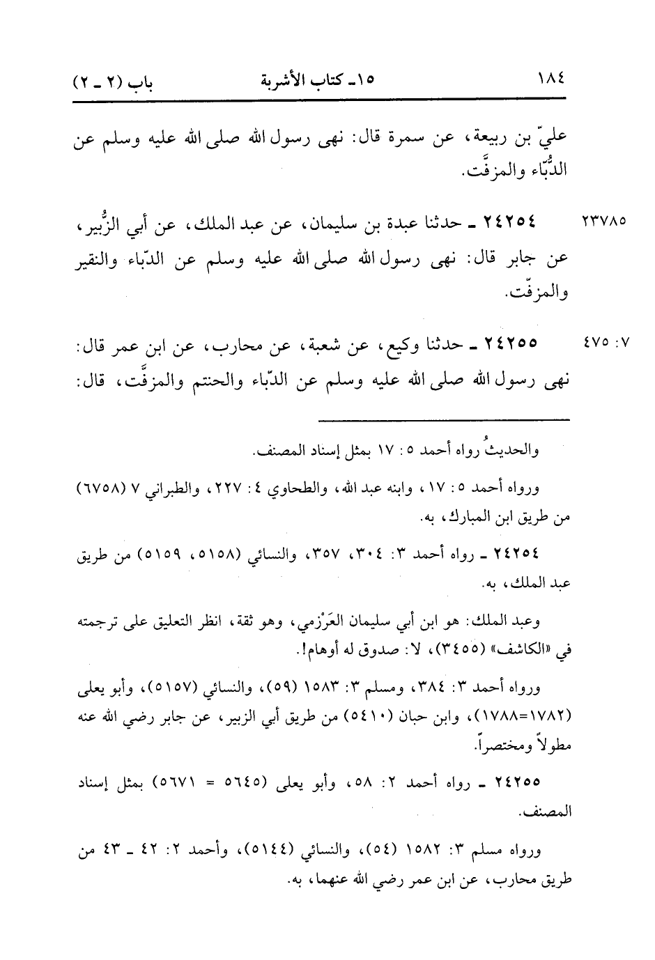 24254- حَدَّثَنَا عَبْدَةُ بْنُ سُلَيْمَانَ ، عَنْ عَبْدِ الْمَلِكِ ، عَنْ أَبِي الزُّبَيْرِ ، عَنْ جَابِرٍ ، قَالَ : نَهَى رَسُولُ اللهِ صَلَّى الله عَلَيْهِ وَسَلَّمَ عَنِ الدُّبَّاءِ وَالنَّقِيرِ وَالْمُزَفَّتِ. (7/474).