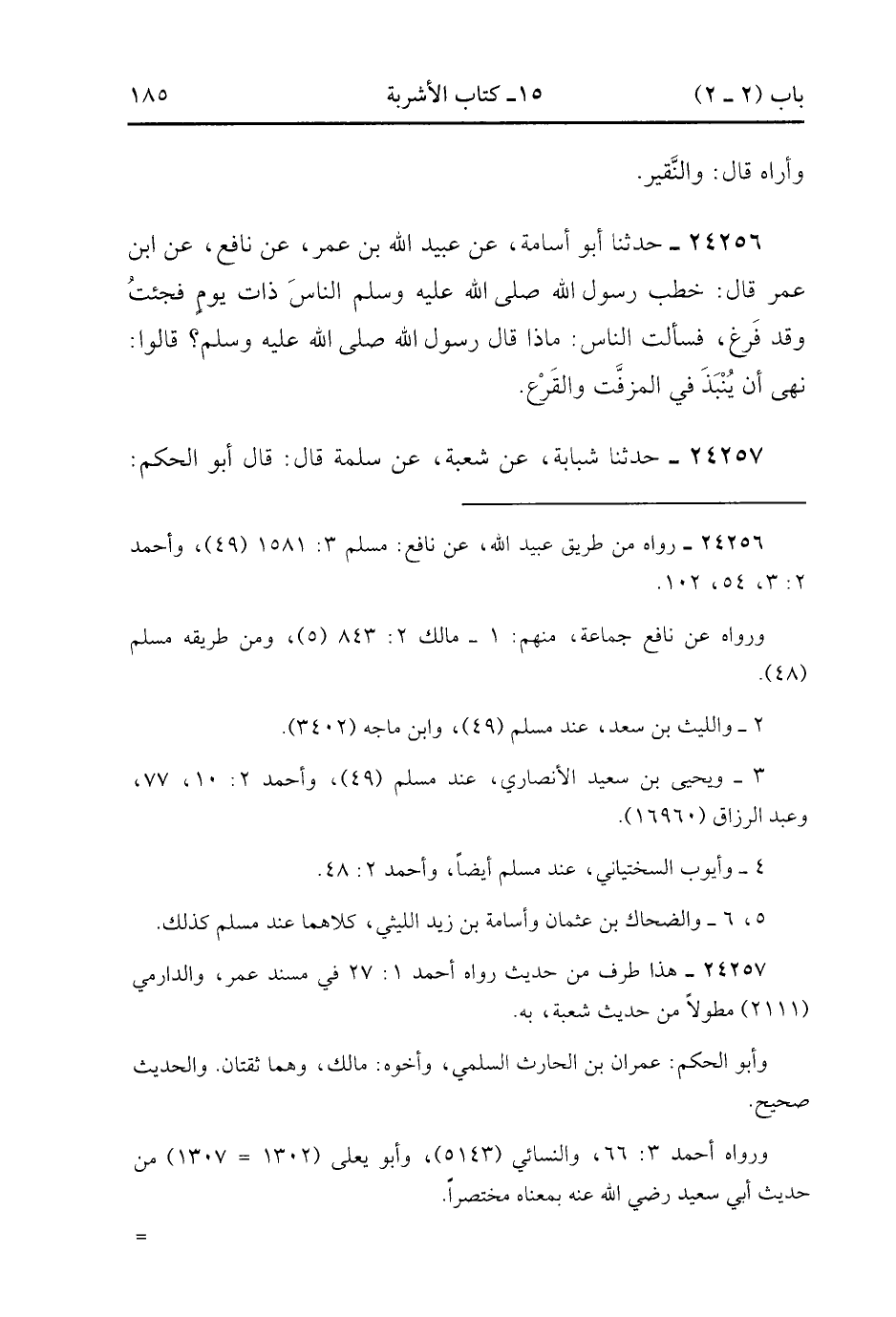 24256- حَدَّثَنَا أَبُو أُسَامَةَ ، عَنْ عُبَيْدِ اللهِ بْنِ عُمَرَ ، عَنْ نَافِعٍ ، عَنِ ابْنِ عُمَرَ ، قَالَ : خَطَبَ رَسُولُ اللهِ صَلَّى الله عَلَيْهِ وَسَلَّمَ النَّاسَ ذَاتَ يَوْمٍ ، فَجِئْتُ وَقَدْ فَرَغَ ، فَسَأَلْتُ النَّاسَ : مَاذَا قَالَ رَسُولُ اللهِ صَلَّى الله عَلَيْهِ وَسَلَّمَ ؟ قَالُوا : نَهَى أَنْ يُنْبَذَ فِي الْمُزَفَّتِ وَالْقَرْعِ.