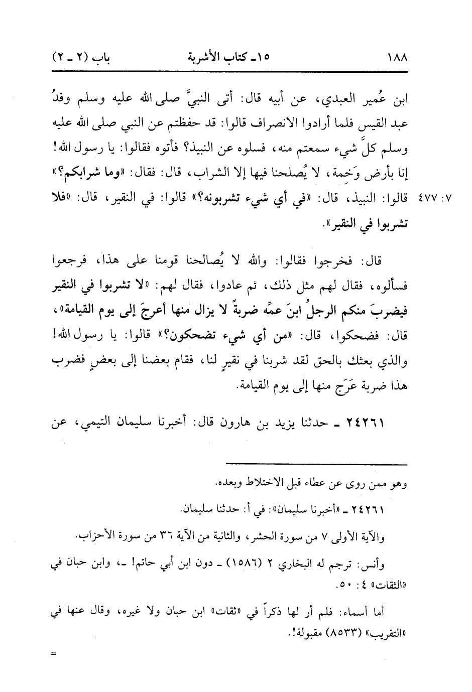 24260- حَدَّثَنَا مُحَمَّدُ بْنُ فُضَيْلٍ ، عَنْ عَطَاءِ بْنِ السَّائِبِ ، عَنْ أَشْعَثَ بْنِ عُمَيْرٍ الْعَبْدِيِّ ، عَنْ أَبِيهِ ، قَالَ : أَتَى النَّبِيَّ صَلَّى الله عَلَيْهِ وَسَلَّمَ وَفْدُ عَبْدِ الْقَيْسِ ، فَلَمَّا أَرَادُوا الاِنْصِرَافَ قَالُوا : قَدْ حَفِظْتُمْ عَنِ النَّبِيِّ صَلَّى الله عَلَيْهِ وَسَلَّمَ كُلَّ شَيْءٍ سَمِعْتُمْ مِنْهُ ، فَسَلُوهُ عَنِ النَّبِيذِ ؟ فَأَتَوْهُ فَقَالُوا : يَا رَسُولَ اللهِ ، إِنَّا بِأَرْضٍ وَخِمَةٍ لاَ يُصْلِحُنَا فِيهَا إِلاَّ الشَّرَابُ ، قَالَ : فَقَالَ : وَمَا شَرَابُكُمْ ؟ قَالُوا : النَّبِيذُ ، قَالَ : فِي أَيِّ شَيْءٍ تَشْرَبُونَهُ ؟ قَالُوا : فِي النَّقِيرِ ، قَالَ : فَلاَ تَشْرَبُوا فِي النَّقِيرِ ، قَالَ : فَخَرَجُوا فَقَالُوا : وَاللَّهِ لاَ يُصَالِحُنَا قَوْمُنَا عَلَى هَذَا ، فَرَجَعُوا فَسَأَلُوهُ ، فَقَالَ لَهُمْ مِثْلَ ذَلِكَ ، ثُمَّ عَادُوا ، فَقَالَ لَهُمْ : لاَ تَشْرَبُوا فِي النَّقِيرِ فَيَضْرِبَ مِنْكُمُ الرَّجُلُ ابْنَ عَمِّهِ ضَرْبَةً لاَ يَزَالُ مِنْهَا أَعْرَجَ إِلَى يَوْمِ الْقِيَامَةِ ، قَالَ : فَضَحِكُوا ، قَالَ : مِنْ أَيِّ شَيْءٍ تَضْحَكُونَ ؟ قَالُوا : يَا رَسُولَ اللهِ ، وَالَّذِي بَعَثَكَ بِالْحَقِّ لَقَدْ شَرِبْنَا فِي نَقِيرٍ لَنَا فَقَامَ بَعْضُنَا إِلَى بَعْضٍ ، فَضَرَبَ هَذَا ضَرْبَةً عَرِجَ مِنْهَا إِلَى يَوْمِ الْقِيَامَةِ. (7/476).
