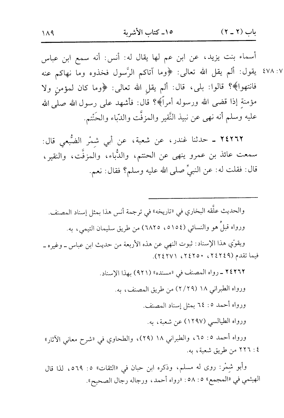 24261- حَدَّثَنَا يَزِيدُ بْنُ هَارُونَ , قَالَ : أَخْبَرَنَا سُلَيْمَانُ التَّيْمِيُّ ، عَنْ أَسْمَاءَ بِنْتِ يَزِيدَ ، عَنِ ابْنِ عَمٍّ لَهَا ، يُقَالَ لَهُ : أَنَسٌ ، أَنَّهُ سَمِعَ ابْنَ عَبَّاسٍ يَقُولُ : أَلَمْ يَقُلَ اللَّهُ تَعَالَى : {وَمَا أَتَاكُمُ الرَّسُولُ فَخُذُوهُ وَمَا نَهَاكُمْ عَنْهُ فَانْتَهُوا} ؟ قَالُوا : بَلَى ، قَالَ : أَلَمْ يَقُلَ اللَّهُ تَعَالَى : {وَمَا كَانَ لِمُؤْمِنٍ وَلاَ مُؤْمِنَةٍ إذَا قَضَى اللَّهُ وَرَسُولُهُ أَمْرًا} ؟ قَالَ : فَأَشْهَدُ عَلَى رَسُولِ اللهِ صَلَّى الله عَلَيْهِ وَسَلَّمَ أَنَّهُ نَهَى عَنْ نَبِيذِ النَّقِيرِ ، وَالْمُزَفَّتِ ، وَالدُّبَّاءِ ، وَالْحَنْتَمِ. (7/477).