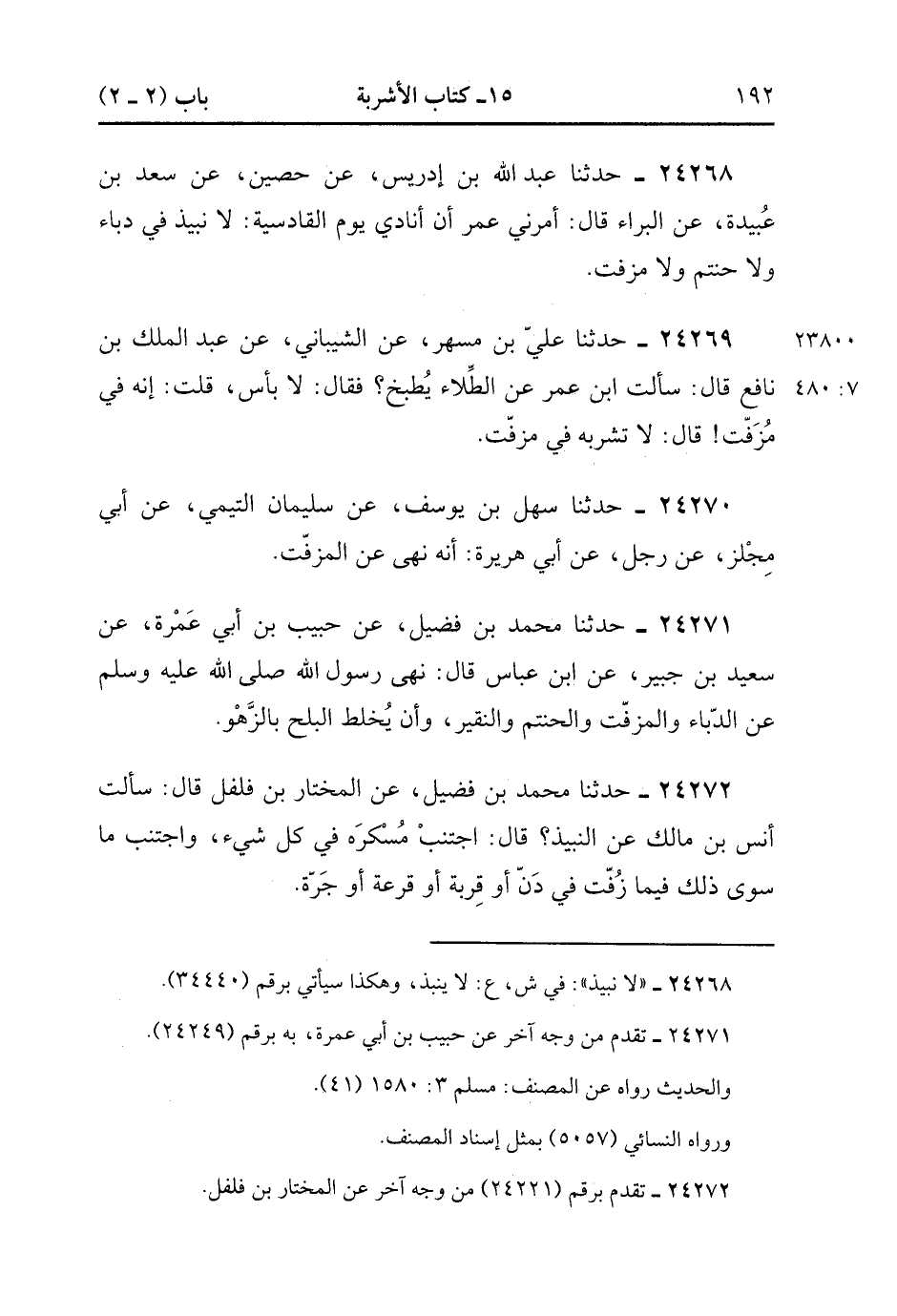 24268- حَدَّثَنَا عَبْدُ اللهِ بْنُ إدْرِيسَ ، عَنْ حُصَيْنٍ ، عَنْ سَعْدِ بْنِ عُبَيْدَةَ ، عَنِ الْبَرَاءِ ، قَالَ : أَمَرَنِي عُمَرُ أَنْ أُنَادِيَ يَوْمَ الْقَادِسِيَّةِ : لاَ نَبِيذَ فِي دُبَّاءٍ ، وَلاَ حَنْتَمٍ ، وَلاَ مُزَفَّتٍ. (7/479).