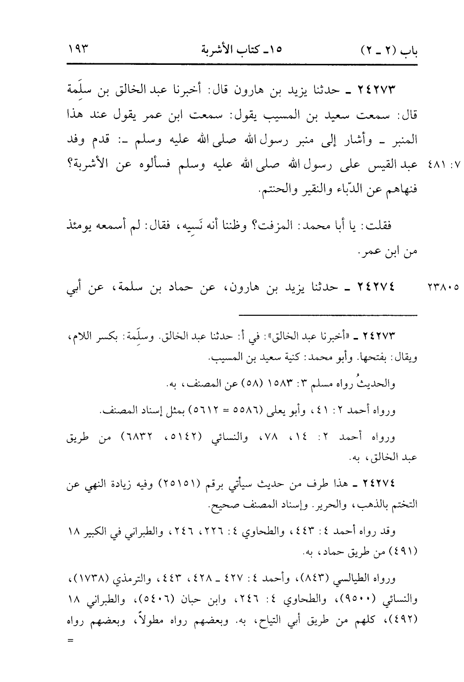 24273- حَدَّثَنَا يَزِيدُ بْنُ هَارُونَ , قَالَ : أَخْبَرَنَا عَبْدُ الْخَالِقِ بْنُ سَلَمَةَ ، قَالَ : سَمِعْتُ سَعِيدَ بْنَ الْمُسَيَّبِ يَقُولُ : سَمِعْتُ ابْنَ عُمَرَ يَقُولُ عِنْدَ هَذَا الْمِنْبَرِ ، وَأَشَارَ إِلَى مِنْبَرِ رَسُولِ اللهِ صَلَّى الله عَلَيْهِ وَسَلَّمَ : قَدِمَ وَفْدُ عَبْدِ الْقَيْسِ عَلَى رَسُولِ اللهِ صَلَّى الله عَلَيْهِ وَسَلَّمَ فَسَأَلُوهُ عَنِ الأَشْرِبَةِ ؟ فَنَهَاهُمْ عَنِ الدُّبَّاءِ ، وَالنَّقِيرِ ، وَالْحَنْتَمِ ، فَقُلْتُ : يَا أَبَا مُحَمَّدٍ ، الْمُزَفَّتِ ؟ وَظَنَنَّا أَنَّهُ نَسِيَهُ ، فَقَالَ : لَمْ أَسْمَعْهُ يَوْمَئِذٍ مِنَ ابْنِ عُمَرَ. (7/480).