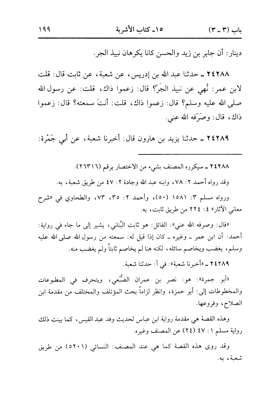 24289- حَدَّثَنَا يَزِيدُ بْنُ هَارُونَ , قَالَ : أَخْبَرَنَا شُعْبَةُ ، عَنْ أَبِي جَمْرَةَ ؛ أَنَّ امْرَأَةً أَتَتِ ابْنَ عَبَّاسٍ ، وَقَدْ كُنْتُ حَلَفْتُ أَنْ لاَ أَسْأَلَ عَنْ نَبِيذِ الْجَرِّ ، فَقَالَتْ لِي : سَلْهُ ، فَأَبَيْتُ أَنْ أَسْأَلَهُ ، فَسَأَلَهُ رَجُلٌ عَنْ نَبِيذِ الْجَرِّ ؟ فَنَهَاهُ ، فَقُلْتُ : يَا أَبَا عَبَّاسٍ ، إِنِّي أَنْتَبِذُ فِي جَرٍّ أَخْضَرَ ، فَأَشْرَبُهُ حُلْوًا طَيِّبًا فَيُقَرْقِرُ بَطْنِي ، فَقَالَ : لاَ تَشْرَبْهُ ، وَإِنْ كَانَ أَحْلَى مِنَ الْعَسَلِ. (7/484).
