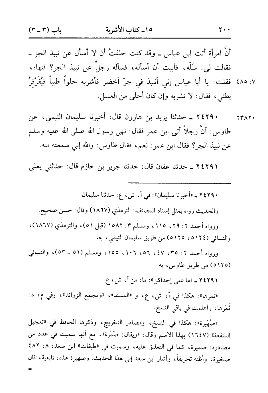24290- حَدَّثَنَا يَزِيدُ بْنُ هَارُونَ , قَالَ : حدَّثَنَا سُلَيْمَانُ التَّيْمِيُّ ، عَنْ طَاوُوسٍ ؛ أَنَّ رَجُلاً أَتَى ابْنَ عُمَرَ فَقَالَ : نَهَى رَسُولُ اللهِ صَلَّى الله عَلَيْهِ وَسَلَّمَ عَنْ نَبِيذِ الْجَرِّ ؟ فَقَالَ ابْنُ عُمَرَ : نَعَمْ ، فَقَالَ طَاوُوسٌ : وَاللَّهِ إنِّي سَمِعْتُهُ مِنْهُ.
