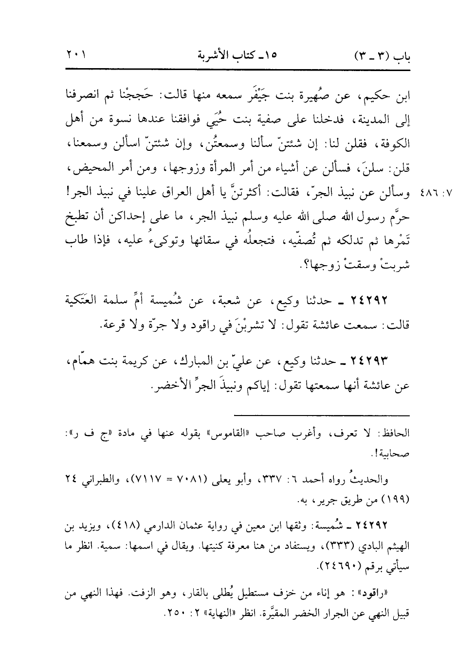 24293- حَدَّثَنَا وَكِيعٌ ، عَنْ عَلِيِّ بْنِ الْمُبَارَكِ ، عَنْ كَرِيمَةَ بِنْتِ هَمَّامٍ ، عَنْ عَائِشَةَ ، أَنَّهَا سَمِعَتْهَا تَقُولُ : إِيَّاكُمْ وَنَبِيذَ الْجَرِّ الأَخْضَرِ. (7/486).