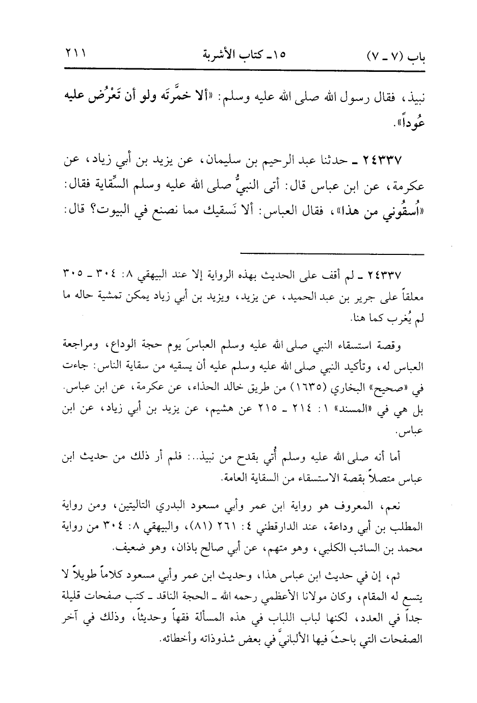 24337- حَدَّثَنَا عَبْدُ الرَّحِيمِ بْنُ سُلَيْمَانَ ، عَنْ يَزِيدَ بْنِ أَبِي زِيَادٍ ، عَنْ عِكْرِمَةَ ، عَنِ ابْنِ عَبَّاسٍ ، قَالَ : أَتَى النَّبِيُّ صَلَّى الله عَلَيْهِ وَسَلَّمَ السِّقَايَةَ ، فَقَالَ : اسْقُونِي مِنْ هَذَا ، فَقَالَ الْعَبَّاسُ : أَلاَ نَسْقِيكَ مِمَّا نَصْنَعُ فِي الْبُيُوتِ ؟ قَالَ : لاَ ، وَلَكِنَ اسْقُونِي مِمَّا يَشْرَبُ النَّاسُ ، قَالَ : فَأُتِيَ بِقَدَحٍ مِنْ نَبِيذٍ فَذَاقَهُ فَقَطَّبَ ، ثُمَّ قَالَ : هَلُمَّوا مَاءً ، فَصَبَّهُ عَلَيْهِ ، ثُمَّ قَالَ : زِدْ فِيهِ ، مَرَّتَيْنِ ، أَوْ ثَلاَثًا ، ثُمَّ قَالَ : إِذَا أَصَابَكُمْ هَذَا فَاصْنَعُوا بِهِ هَكَذَا. (7/497).