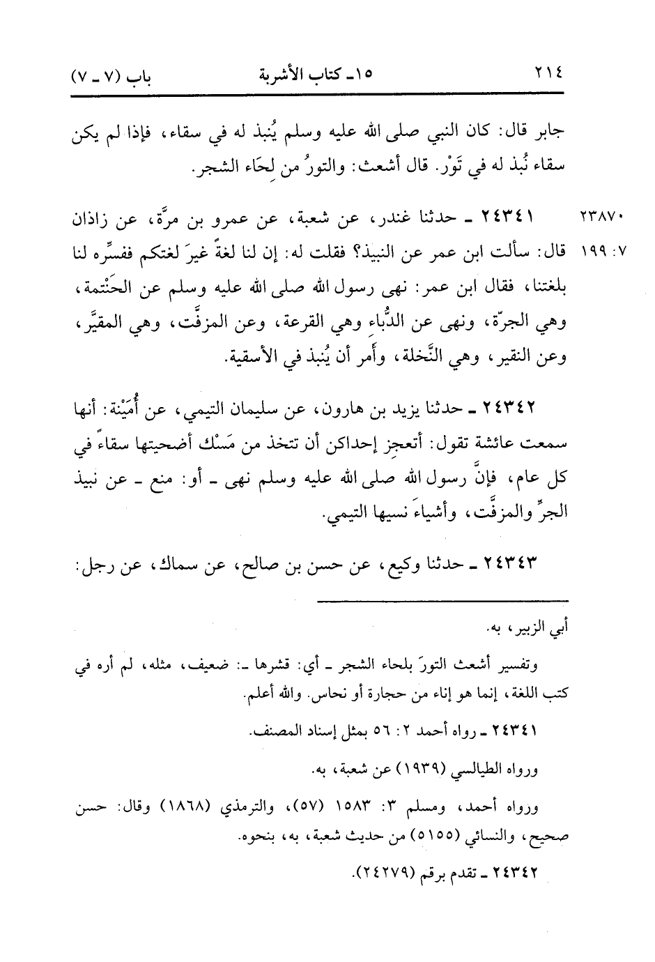 24341- حَدَّثَنَا غُنْدَرٌ ، عَنْ شُعْبَةَ ، عَنْ عَمْرِو بْنِ مُرَّةَ ، عَنْ زَاذَانَ ، قَالَ : سَأَلْتُ ابْنَ عُمَرَ عَنِ النَّبِيذِ ؟ فَقُلْتُ لَهُ : إِنَّ لَنَا لُغَةً غَيْرَ لُغَتِكُمْ ، فَفَسِّرْهُ لَنَا بِلُغَتِنَا ، فَقَالَ ابْنُ عُمَرَ : نَهَى رَسُولُ اللهِ صَلَّى الله عَلَيْهِ وَسَلَّمَ عَنِ الْحَنْتَمَةِ ، وَهِيَ الْجَرَّةُ ، وَنَهَى عَنِ الدَّبَّاءِ ، وَهِيَ الْقَرْعَةُ ، وَعَنِ الْمُزَفَّتِ وَهِيَ الْمُقَيَّرُ ، وَعَنِ النَّقِيرِ ، وَهِيَ النَّخْلَةُ ، وَأَمَرَ أَنْ يُنْبَذَ فِي الأَسْقِيَةِ.