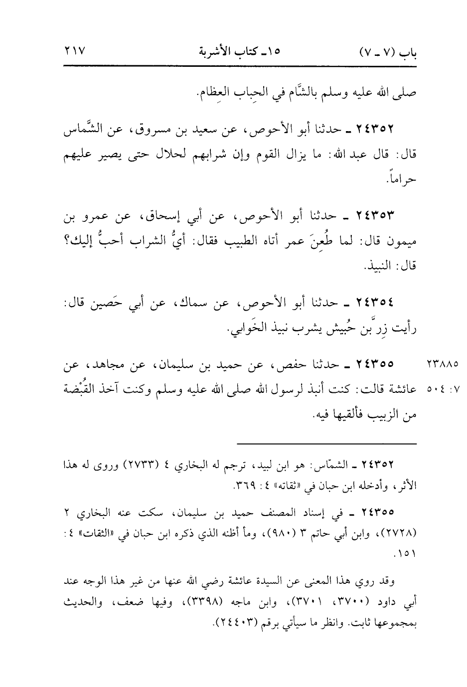 24354- حَدَّثَنَا أَبُو الأَحْوَصِ ، عَنْ سِمَاكٍ ، عَنْ أَبِي حَصِينٍ ، قَالَ : رَأَيْتُ زِرَّ بْنَ حُبَيْشٍ يَشْرَبُ نَبِيذَ الْخَوَابِي.