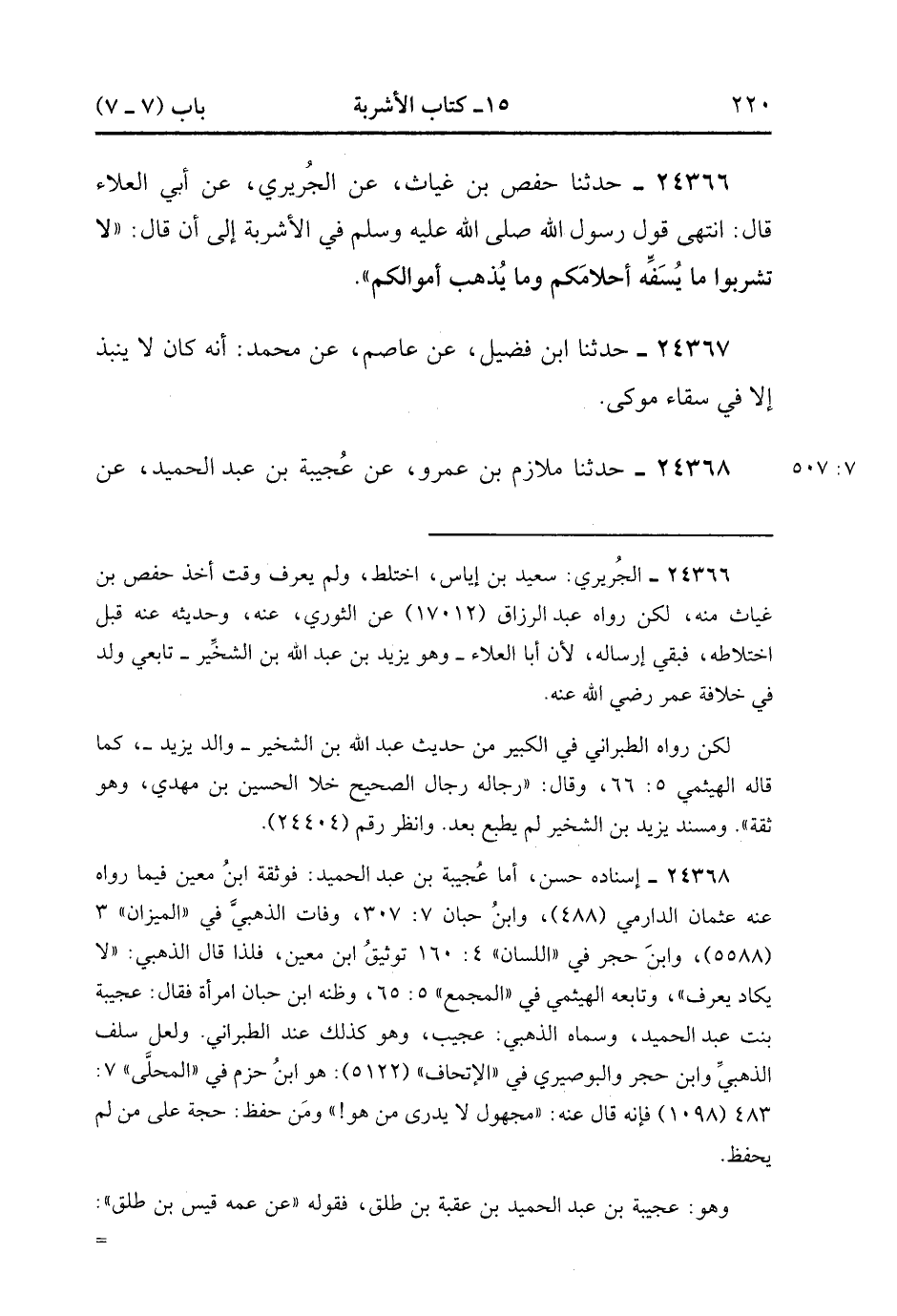 24366- حَدَّثَنَا حَفْصُ بْنُ غِيَاثٍ ، عَنِ الْجُرَيْرِيِّ ، عَنْ أَبِي الْعَلاَءِ ، قَالَ : انْتَهَى قَوْلُ رَسُولِ اللهِ صَلَّى الله عَلَيْهِ وَسَلَّمَ فِي الأَشْرِبَةِ إِلَى أَنْ قَالَ : لاَ تَشْرَبُوا مَا يُسَفِّهُ أَحْلاَمَكُمْ ، وَمَا يُذْهِبُ أَمْوَالَكُمْ.