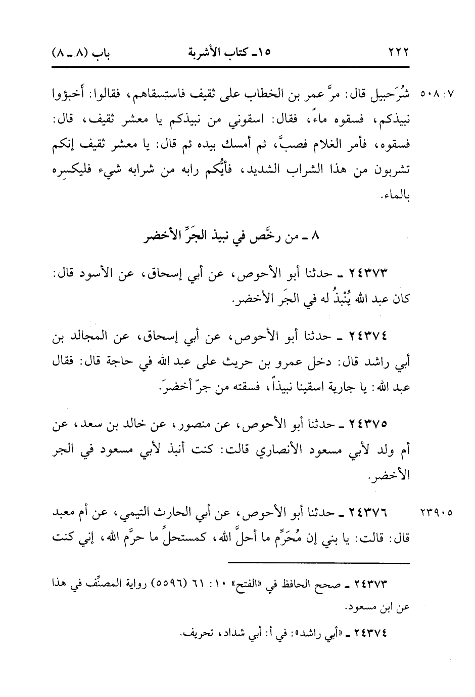 24373- حَدَّثَنَا أَبُو الأَحْوَصِ ، عَنْ أَبِي إِسْحَاقَ ، عَنِ الأَسْوَدِ ، قَالَ : كَانَ عَبْدُ اللهِ يُنْبَذُ لَهُ فِي الْجَرِّ الأَخْضَرِ.
