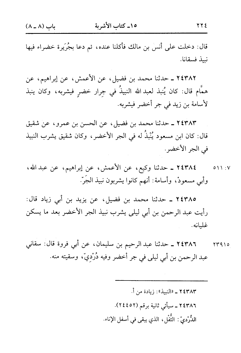 24386- حَدَّثَنَا عَبْدُ الرَّحِيمِ بْنُ سُلَيْمَانَ ، عَنْ أَبِي فَرْوَةَ ، قَالَ : سَقَانِي عَبْدُ الرَّحْمَنِ بْنُ أَبِي لَيْلَى فِي جَرٍّ أَخْضَرَ ، وَفِيهِ دُرْدِيٌّ ، وَسَقَيْتُهُ مِنْهُ. (7/511).