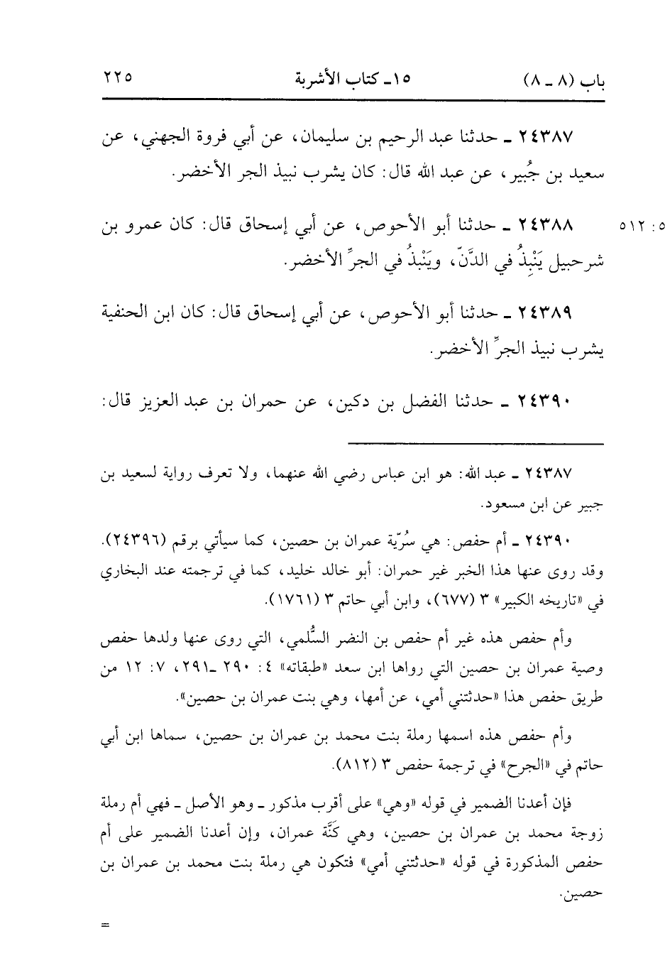 24390- حَدَّثَنَا الْفَضْلُ بْنُ دُكَيْنٍ ، عَنْ حُمْرَانَ بْنِ عَبْدِ الْعَزِيزِ ، قَالَ : حدَّثَتْنِي أُمُّ حَفْصٍ ، قَالَتْ : كُنْتُ أَنْبِذُ لِعِمْرَانَ بْنِ حُصَيْنٍ فِي جَرٍّ. (7/512).