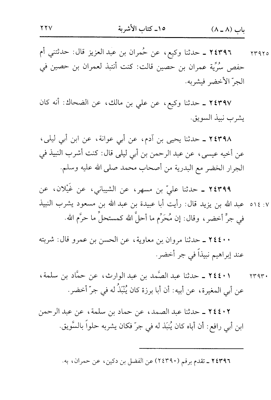 24398- حَدَّثَنَا يَحْيَى بْنُ آدَمَ ، عَنْ أَبِي عَوَانَةَ ، عَنِ ابْنِ أَبِي لَيْلَى ، عَنْ أَخِيهِ عِيسَى ، عَنْ عَبْدِ الرَّحْمَنِ بْنِ أَبِي لَيْلَى ، قَالَ : كُنْتُ أَشْرَبُ النَّبِيذَ فِي الْجِرَارِ الْخُضْرِ ، مَعَ الْبَدْرِيَّةِ مِنْ أَصحَاب مُحَمَّدٍ صَلَّى الله عَلَيْهِ وَسَلَّمَ.