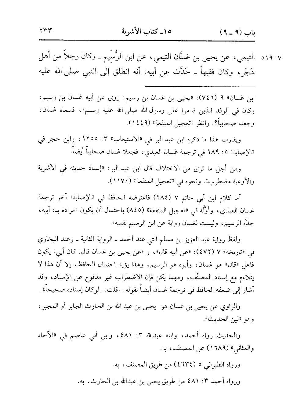 24417- حَدَّثَنَا عَبْدُ الرَّحِيمِ بْنُ سُلَيْمَانَ ، عَنْ يَحْيَى بْنِ الْحَارِثِ التَّيْمِيِّ ، عَنْ يَحْيَى بْنِ غَسَّانَ التَّيْمِيِّ ، عَنِ ابْنِ الرَّسِيمَ ، وَكَانَ رَجُلاً مِنْ أَهْلِ هَجَرَ ، وَكَانَ فَقِيهًا حَدَّثَ ، عَنْ أَبِيهِ ؛ أَنَّهُ انْطَلَقَ إلَى النَّبِيِّ صَلَّى الله عَلَيْهِ وَسَلَّمَ فِي وَفْدٍ فِي صَدَقَةٍ يَحْمِلُهَا إِلَيْهِ ، قَالَ : فَنَهَاهُمْ عَنِ النَّبِيذِ فِي هَذِهِ الظُّرُوفِ ، فَرَجَعُوا إِلَى أَرْضِهِمْ ، وَهِيَ أَرْضُ تِهَامَةَ حَارَّةً ، فَاسْتَوْخَمُوهَا ، فَرَجَعُوا إِلَيْهِ الْعَامَ الثَّانِيَ فِي صَدَقَاتِهِمْ ، فَقَالُوا : يَا رَسُولَ اللهِ ، إِنَّك نَهَيْتَنَا عَنْ هَذِهِ الأَوْعِيَةِ فَتَرَكْنَاهَا ، وَشَقَّ ذَلِكَ عَلَيْنَا ، فَقَالَ : اذْهَبُوا فَاشْرَبُوا فِيمَا شِئْتُمْ ، مَنْ شَاءَ أَوْكَى سِقَاءَهُ عَلَى إِثْمَ. (7/518).