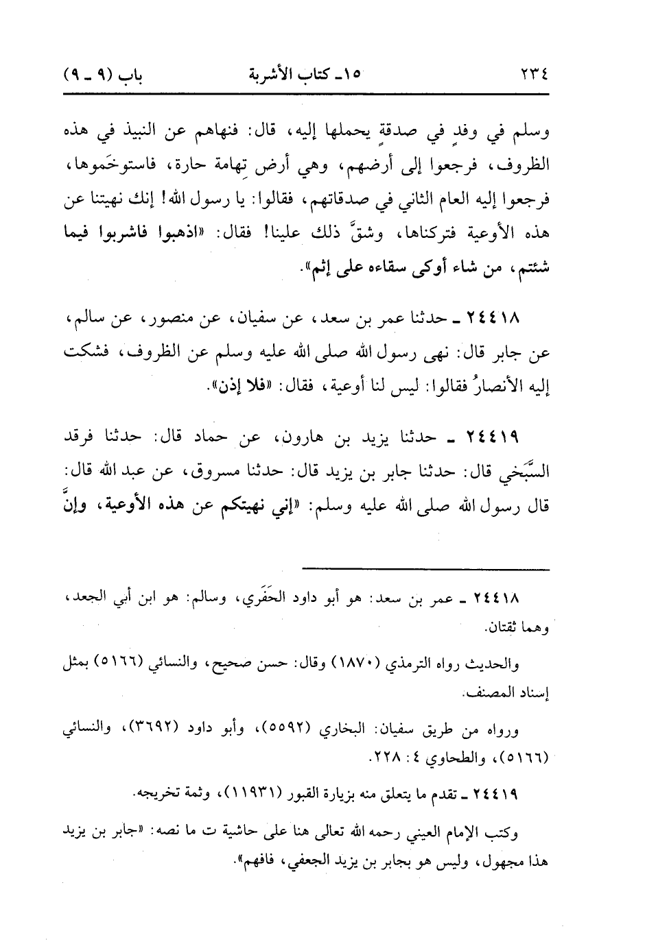 24419- حَدَّثَنَا يَزِيدُ بْنُ هَارُونَ ، عَنْ حَمَّادٍ , قَالَ : حدَّثَنَا فَرْقَدٌ السَّبَخِيُّ ، قَالَ : حَدَّثَنَا جَابِرُ بْنُ يَزِيدَ ، قَالَ : حَدَّثَنَا مَسْرُوقٌ ، عَنْ عَبْدِ اللهِ ، قَالَ : قَالَ رَسُولُ اللهِ صَلَّى الله عَلَيْهِ وَسَلَّمَ : إِنِّي نَهَيْتُكُمْ عَنْ هَذِهِ الأَوْعِيَةِ ، وَإِنَّ الأَوْعِيَةَ لاَ تُحِلُّ شَيْئًا ، وَلاَ تُحَرِّمُهُ ، فَاشْرَبُوا فِيهَا. (7/519).
