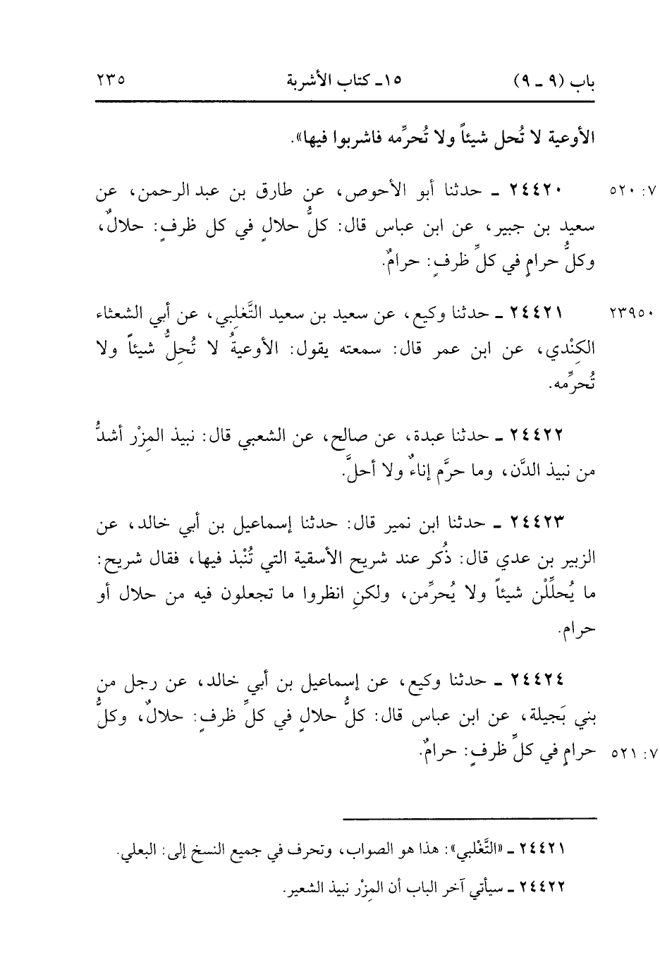 24424- حَدَّثَنَا وَكِيعٌ ، عَنْ إسْمَاعِيلَ بْنِ أَبِي خَالِدٍ ، عَنْ رَجُلٍ مِنْ بَنِي بَجِيلَةَ ، عنِ ابْنِ عَبَّاسٍ ، قَالَ : كُلُّ حَلاَلٍ فِي كُلِّ ظَرْفٍ حَلاَلٌ ، وَكُلُّ حَرَامٍ فِي كُلِّ ظَرْفٍ حَرَامٌ. (7/520).