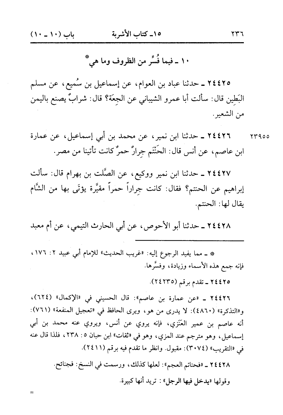 24427- حَدَّثَنَا ابْنُ نُمَيْرٍ ، وَوَكِيعٌ ، عَنِ الصَّلْتِ بْنِ بَهْرَامَ ، قَالَ : سَأَلْتُ إبْرَاهِيمَ عَنِ الْحَنْتَمِ ؟ قَالَ : كَانَتْ جِرَارًا حُمْرًا مُقَيَّرَةً ، يُؤْتَى بِهَا مِنَ الشَّامِ ، يُقَالَ لَهَا : الْحَنْتَمُ.
