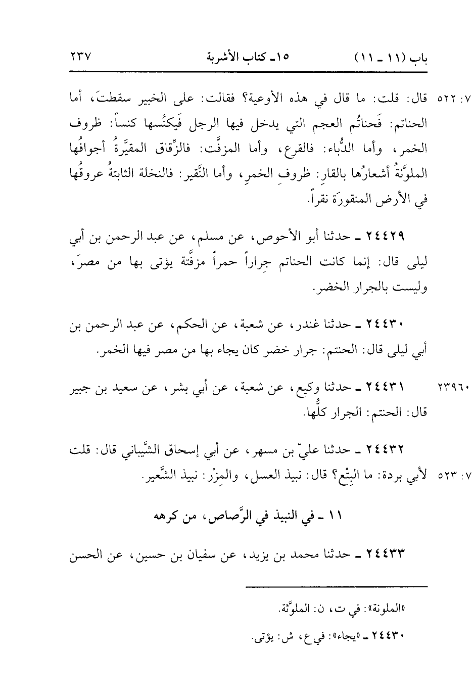 24430- حَدَّثَنَا غُنْدَرٌ ، عَنْ شُعْبَةَ ، عَنِ الْحَكَمِ ، عَنْ عَبْدِ الرَّحْمَنِ بْنِ أَبِي لَيْلَى ، قَالَ : الْحَنْتَمُ جِرَارٌ خُضْرٌ كَانَ يُجَاءُ بِهَا مِنْ مِصْرَ ، فِيهَا الْخَمْرُ.