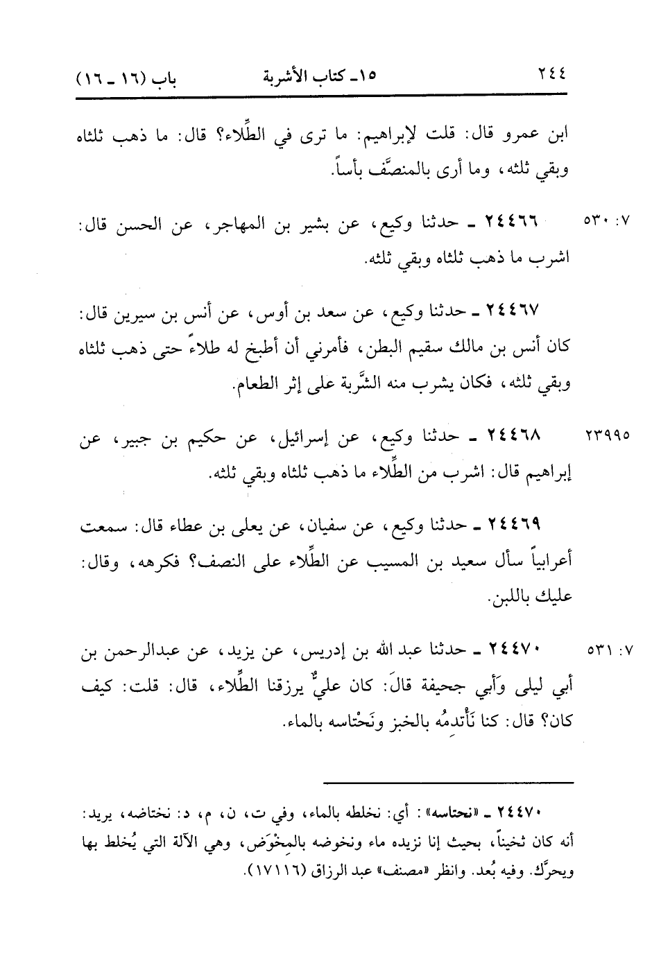 24470- حَدَّثَنَا عَبْدُ اللهِ بْنُ إدْرِيسَ ، عَنْ يَزِيدَ ، عَنْ عَبْدِ الرَّحْمَنِ بْنِ أَبِي لَيْلَى ، وَأَبِي جُحَيْفَةَ ، قَالاَ : كَانَ عَلِيٌّ يَرْزُقُنَا الطِّلاَءَ ، قَالَ : قُلْتُ : كَيْفَ كَانَ ؟ قَالَ : كُنَّا نَأْتَدِمُهُ بِالْخُبْزِ ، وَنَحْتَاسُهُ بِالْمَاءِ. (7/530).