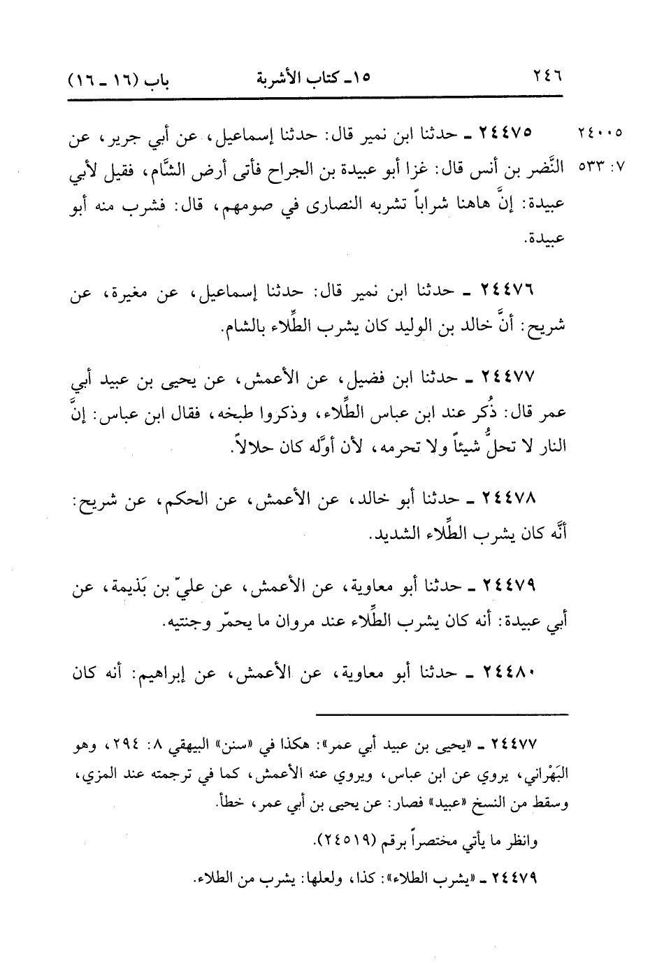 24478- حَدَّثَنَا أَبُو خَالِدٍ ، عَنِ الأَعْمَشِ ، عَنِ الْحَكَمِ ، عَنْ شُرَيْحٍ ؛ أَنَّهُ كَانَ يَشْرَبُ الطِّلاَءَ الشَّدِيدَ. (7/532).