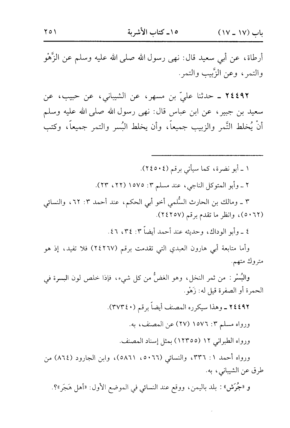 24492- حَدَّثَنَا عَلِيُّ بْنُ مُسْهِرٍ ، عَنِ الشَّيْبَانِيِّ ، عَنْ حَبِيبٍ ، عَنْ سَعِيدِ بْنِ جُبَيْرٍ ، عَنِ ابْنِ عَبَّاسٍ ، قَالَ : نَهَى رَسُولُ اللهِ صَلَّى الله عَلَيْهِ وَسَلَّمَ أَنْ يُخْلَطَ التَّمْرُ وَالزَّبِيبُ جَمِيعًا ، وَأَنْ يُخْلَطَ الْبُسْرُ وَالتَّمْرُ جَمِيعًا ، وَكَتَبَ إلَى أَهْلِ جُرَشَ يَنْهَاهُمْ عَنْ خَلْطِ التَّمْرِ وَالزَّبِيبِ. (7/537).