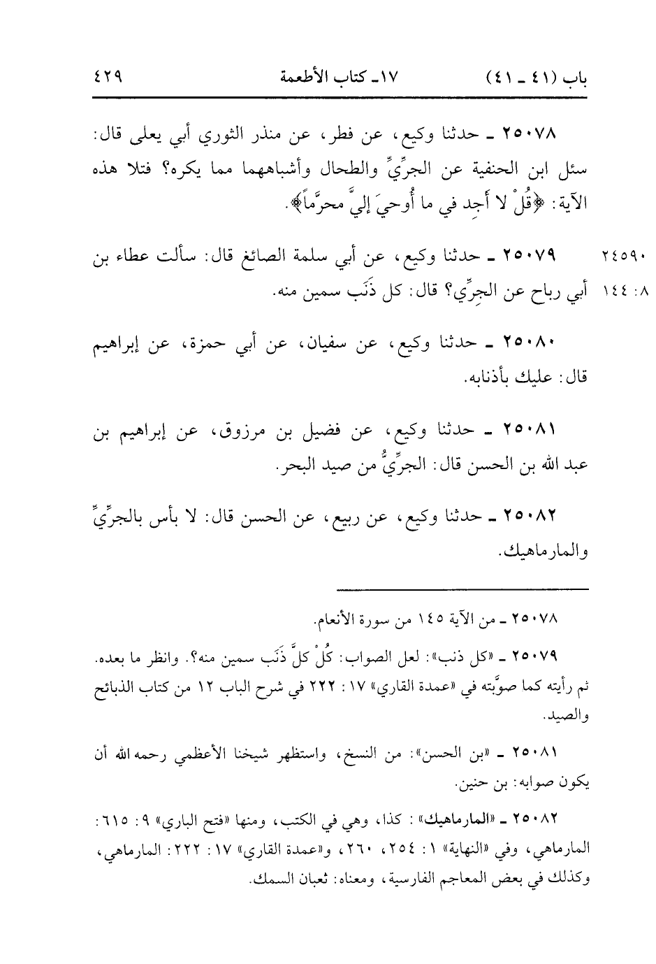 25079- حَدَّثَنَا وَكِيعٌ ، عَنْ أَبِي سَلَمَةَ الصَّائِغِ ، قَالَ : سَأَلْتُ عَطَاءَ بْنَ أَبِي رَبَاحٍ عَنِ الْجَرِّيِّ ؟ قَالَ : كُلْ ذنْبٍ سَمِينٍ مِنْهُ.