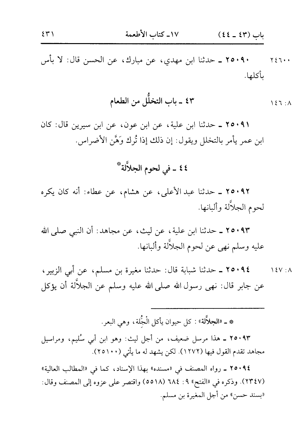 25094- حَدَّثَنَا شَبَابَةُ , قَالَ : حدَّثَنَا مُغِيرَةُ بْنُ مُسْلِمٍ ، عَنْ أَبِي الزُّبَيْرِ ، عَنْ جَابِرٍ ، قَالَ : نَهَى رَسُولُ اللهِ صَلَّى الله عَلَيْهِ وَسَلَّمَ عَنِ الْجَلاَلَةِ أَنْ يُؤْكَلَ لَحْمُهَا ، أَوْ يُشْرَبَ لَبَنُهَا. (8/146).