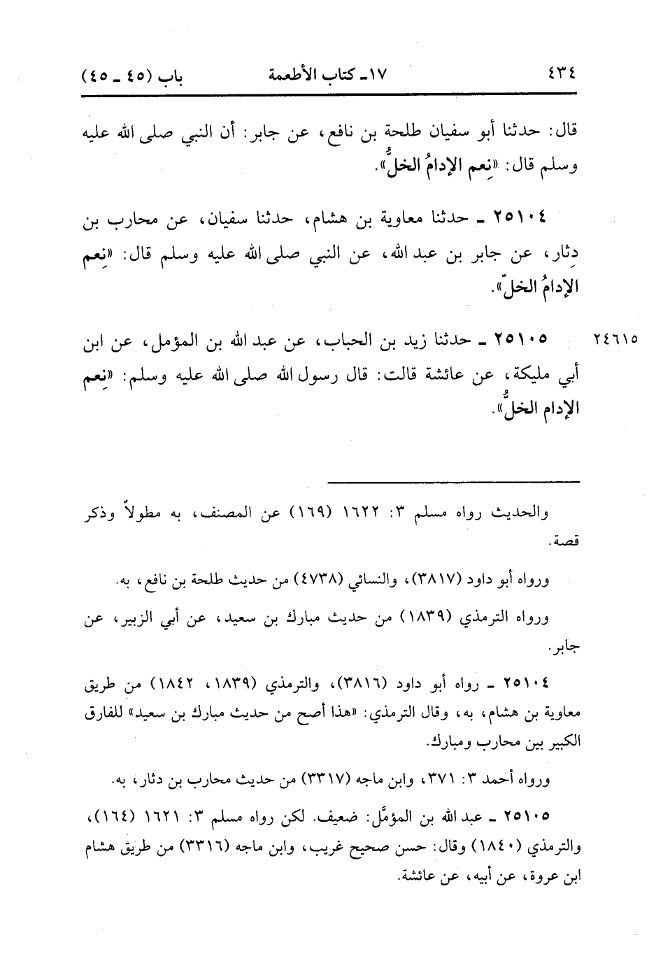 25103- حَدَّثَنَا يَزِيدُ بْنُ هَارُونَ , قَالَ : أَخْبَرَنَا حَجَّاجُ بْنُ أَبِي زَيْنَبَ ، قَالَ : حَدَّثَنَا أَبُو سُفْيَانَ طَلْحَةُ بْنُ نَافِعٍ ، عَنْ جَابِرٍ ؛ أَنَّ النَّبِيَّ صَلَّى الله عَلَيْهِ وَسَلَّمَ ، قَالَ : نِعْمَ الإِدَامُ الْخَلُّ. (8/148).