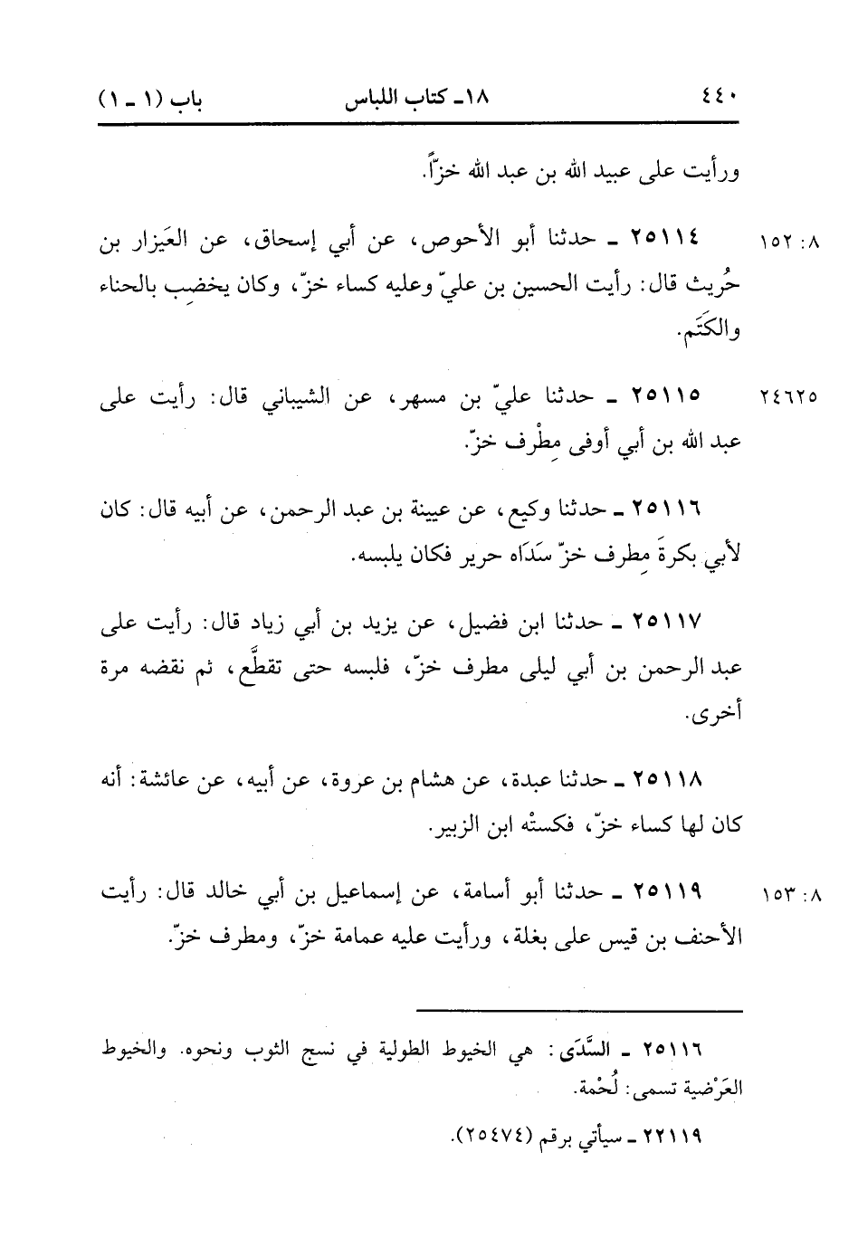 25115- حَدَّثَنَا عَلِيُّ بْنُ مُسْهِرٍ ، عَنِ الشَّيْبَانِيِّ ، قَالَ : رَأَيْتُ عَلَى عَبْدِ اللهِ بْنِ أَبِي أَوْفَى مِطْرَفَ خَزٍّ.