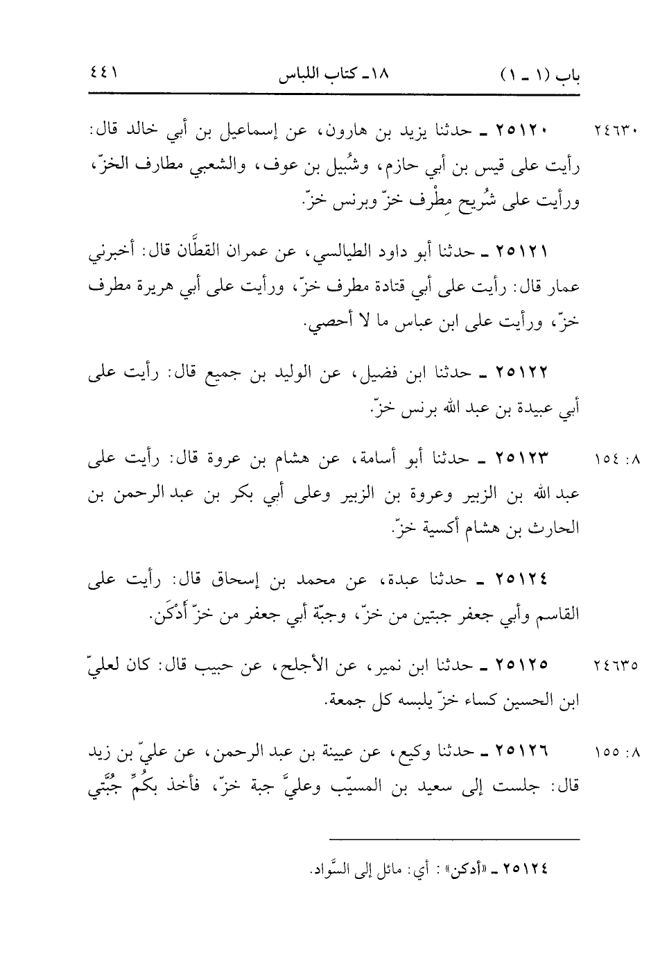 25123- حَدَّثَنَا أَبُو أُسَامَةَ ، عَنْ هِشَامِ بْنِ عُرْوَةَ ، قَالَ : رَأَيْتُ عَلَى عَبْدِ اللهِ بْنِ الزُّبَيْرِ ، وَعُرْوَةَ بْنِ الزُّبَيْرِ ، وَعَلَى أَبِي بَكْرِ بْنِ عَبْدِ الرَّحْمَنِ بْنِ الْحَارِثِ بْنِ هِشَامٍ أَكْسِيَةَ خَزٍّ.
