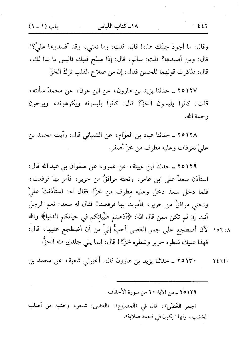 25127- حَدَّثَنَا يَزِيدُ بْنُ هَارُونَ ، عَنِ ابْنِ عَوْنٍ ، عَنْ مُحَمَّدٍ ، سَأَلْتُهُ ، قُلْتُ : كَانُوا يَلْبَسُونَ الْخَزَّ ؟ قَالَ : كَانُوا يَلْبَسُونَهُ وَيَكْرَهُونَهُ ، وَيَرْجُونَ رَحْمَةَ اللهِ.
