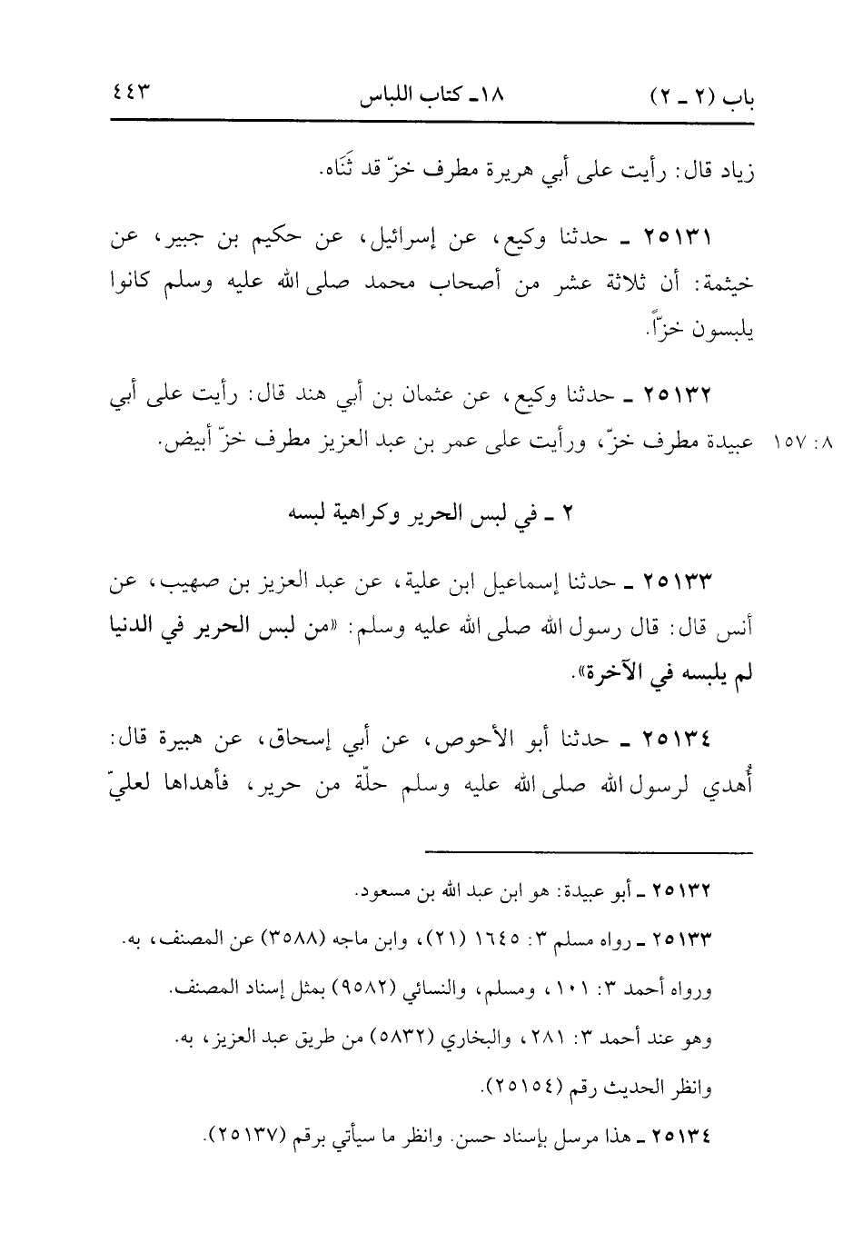 25133- حَدَّثَنَا إِسْمَاعِيلُ بْنُ عُلَيَّةَ ، عَنْ عَبْدِ الْعَزِيزِ بْنِ صُهَيْبٍ ، عَنْ أَنَسٍ ، قَالَ : قَالَ رَسُولُ اللهِ صَلَّى الله عَلَيْهِ وَسَلَّمَ : مَنْ لَبِسَ الْحَرِيرَ فِي الدُّنْيَا لَمْ يَلْبَسْهُ فِي الآخِرَةِ. (8/157.