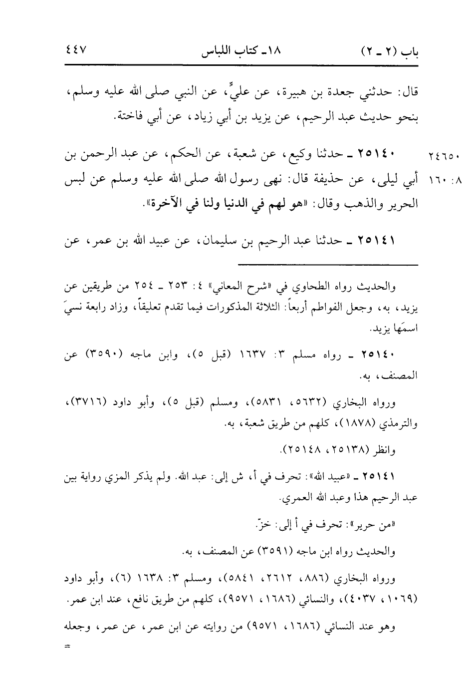 25141- حَدَّثَنَا عَبْدُ الرَّحِيمِ بْنُ سُلَيْمَانَ ، عَنْ عُبَيْدِ اللهِ بْنِ عُمَرَ ، عَنْ نَافِعٍ ؛ أَنَّ ابْنَ عُمَرَ أَخْبَرَهُ ، أَنَّ عُمَرَ بْنَ الْخَطَّابَ رَأَى حُلَّةً سِيَرَاءَ مِنْ حَرِيرٍ ، فَقَالَ : يَا رَسُولَ اللهِ ، لَوِ ابْتَعْتَ هَذِهِ الْحُلَّةَ لِلْوَفْدِ وَلِيَوْمِ الْجُمُعَةِ ؟ فَقَالَ : إِنَّمَا يَلْبَسُ هَذِهِ مَنْ لاَ خَلاَقَ لَهُ فِي الآخِرَةِ. (8/160.