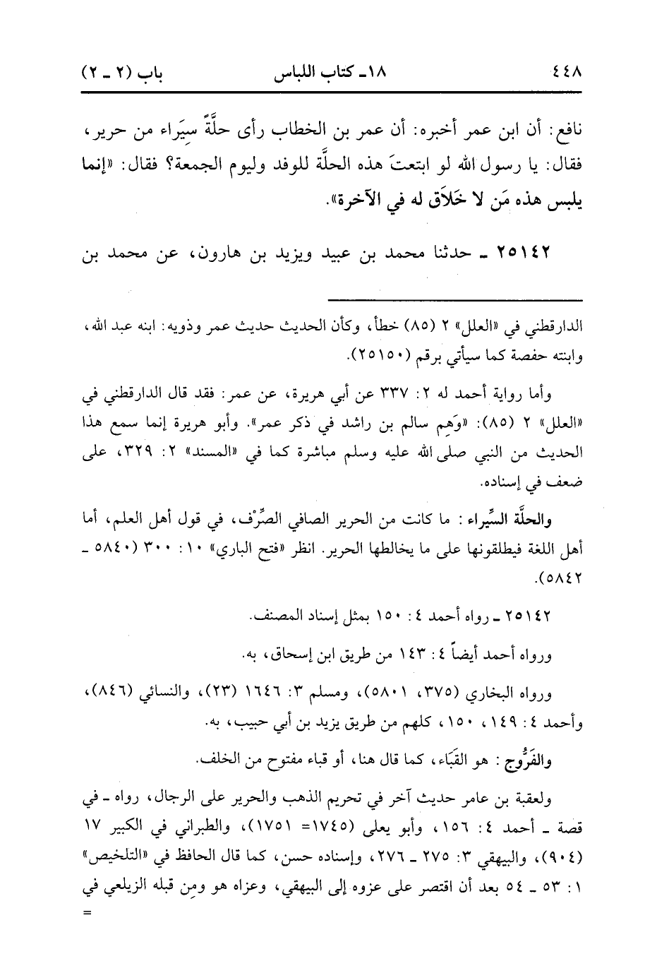 25142- حَدَّثَنَا مُحَمَّدُ بْنُ عُبَيْدٍ ، وَيَزِيدُ بْنُ هَارُونَ ، عَنْ مُحَمَّدِ بْنِ إِسْحَاقَ ، عَنْ يَزِيدَ بْنِ أَبِي حَبِيبٍ ، عَنْ مَرْثَدَ بْنِ عَبْدِ اللهِ الْيَزَنِيِّ ، عَنْ عُقْبَةَ بْنِ عَامِرٍ الْجُهَنِيِّ ، قَالَ : صَلَّى بِنَا رَسُولُ اللهِ صَلَّى الله عَلَيْهِ وَسَلَّمَ الْمَغْرِبَ وَعَلَيْهِ فَرُّوجٌ ، يَعْنِي قَبَاءً مِنْ حَرِيرٍ ، فَلَمَّا قَضَى صَلاَتَهُ نَزَعَهُ نَزْعًا عَنِيفًا ، فَقُلْتُ : يَا رَسُولَ اللهِ ، صَلَّيْتَ وَهُوَ عَلَيْك ، قَالَ : إِنَّ هَذَا لاَ يَنْبَغِي لِلْمُتَّقِينَ. (8/160.