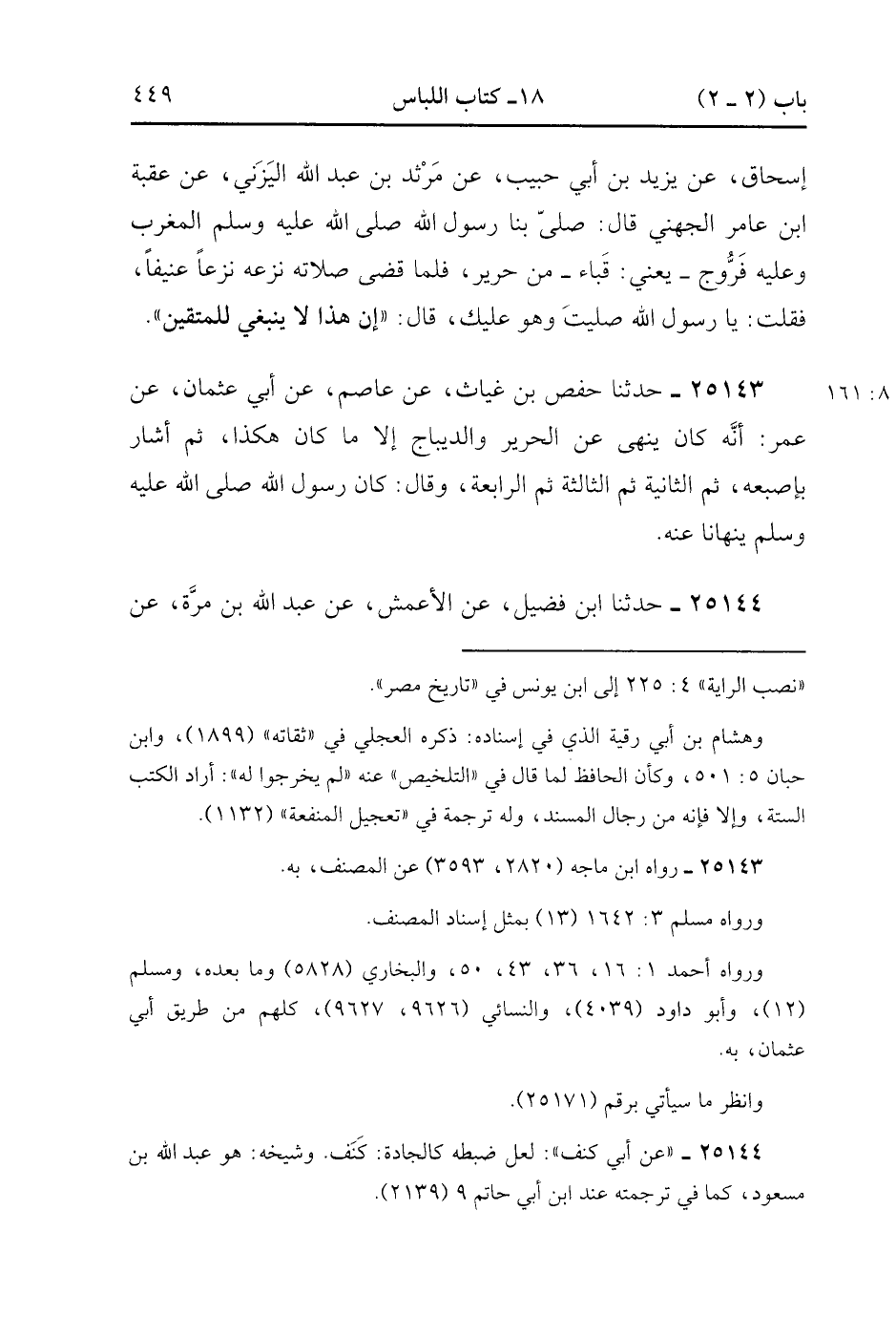 25144- حَدَّثَنَا ابْنُ فُضَيْلٍ ، عَنِ الأَعْمَشِ ، عَنْ عَبْدِ اللهِ بْنِ مُرَّةَ ، عَنْ أَبِي كَنَفٍ ، قَالَ : انْطَلَقْتُ مَعَ عَبْدِ اللهِ حَتَّى أَتَيْتُ دَارَهِ ، فَأَتَاهُ بَنُونَ لَهُ عَلَيْهِمْ قُمُصُ حَرِيرٍ فَخَرَقَهَا ، وَقَالَ : انْطَلِقُوا إِلَى أُمِّكُمْ فَلْتُلْبِسكُمْ غَيْرَ هَذَا. (8/161.