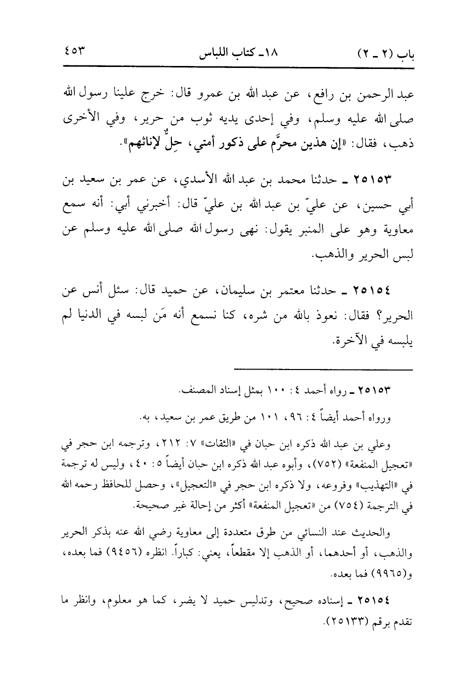 25153- حَدَّثَنَا مُحَمَّدُ بْنُ عَبْدِ اللهِ الأَسَدِيُّ ، عَنْ عُمَرَ بْنِ سَعِيدِ بْنِ أَبِي حُسَيْنٍ ، عَنْ عَلِيِّ بْنِ عَبْدِ اللهِ بْنِ عَلِيٍّ ، قَالَ : أَخْبَرَنِي أَبِي ، أَنَّهُ سَمِعَ مُعَاوِيَةَ وَهُوَ عَلَى الْمِنْبَرِ ، يَقُولُ : نَهَى رَسُولُ اللهِ صَلَّى الله عَلَيْهِ وَسَلَّمَ عَنْ لُبْسِ الْحَرِيرِ وَالذَّهَبِ.