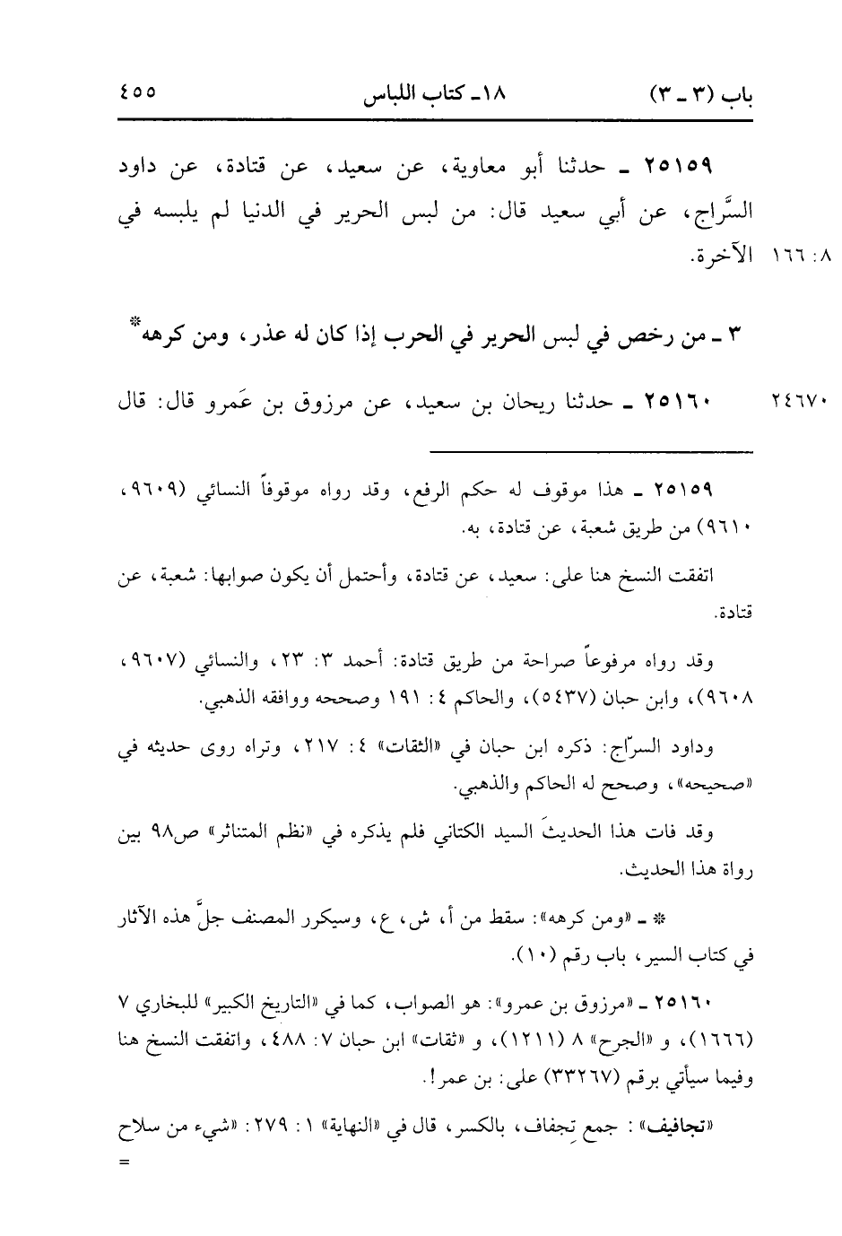25160- حَدَّثَنَا رَيْحَانُ بْنُ سَعِيدٍ ، عَنْ مَرْزُوقِ بْنِ عَمْرٍو ، قَالَ : قَالَ أَبُو فَرْقَدٍ : رَأَيْتُ عَلَى تَجَافِيفِ أَبِي مُوسَى الدِّيبَاجَ وَالْحَرِيرَ. (8/166.