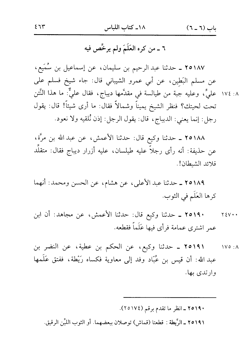25188- حَدَّثَنَا وَكِيعٌ , قَالَ : حدَّثَنَا الأَعْمَشُ ، عَنْ عَبْدِ اللهِ بْنِ مُرَّةَ ، عَنْ حُذَيْفَةَ ؛ أَنَّهُ رَأَى رَجُلاً عَلَيْهِ طَيْلَسَانٌ عَلَيْهِ أَزْرَارُ دِيبَاجٍ ، فَقَالَ : مُتَقَلِّدٌ قَلاَئِدَ الشَّيْطَانِ.