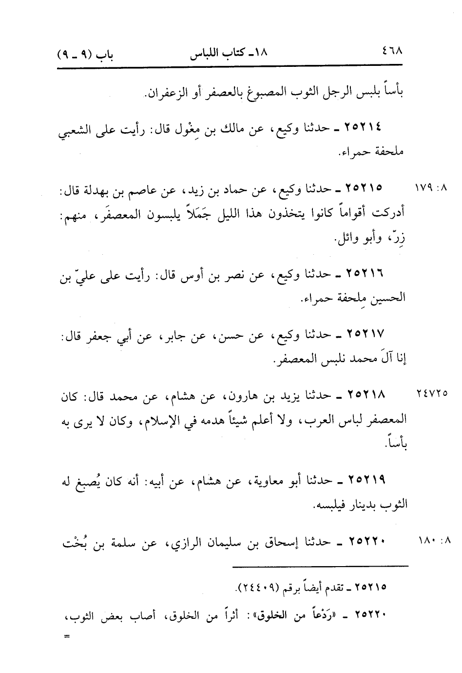 25219- حَدَّثَنَا أَبُو مُعَاوِيَةَ ، عَنْ هِشَامٍ ، عَنْ أَبِيهِ ، أَنَّهُ كَانَ يُصْبَغُ لَهُ الثَّوْبُ بِدِينَارٍ فَيَلْبَسُهُ.(8/179.